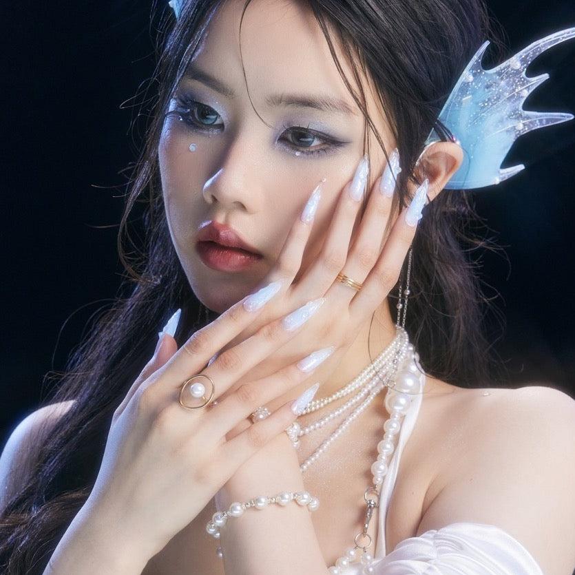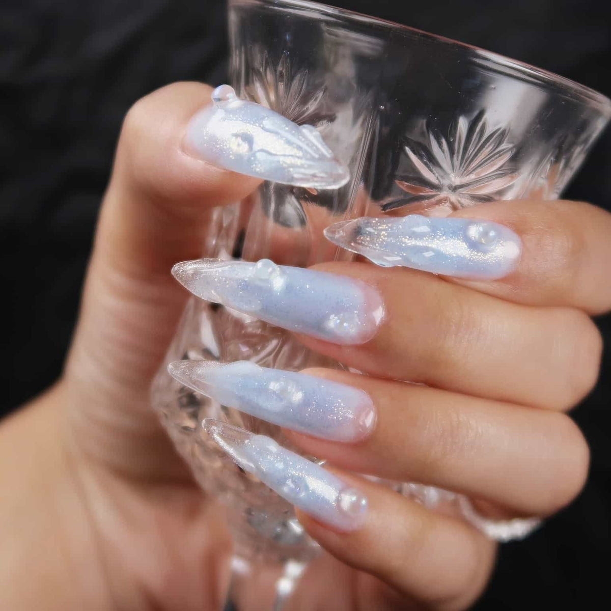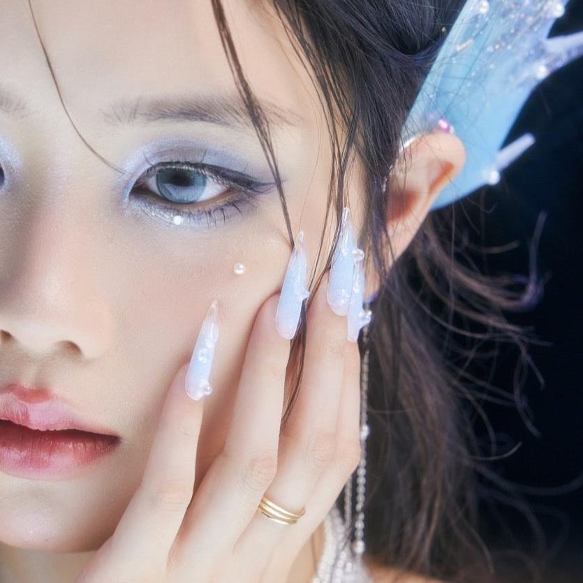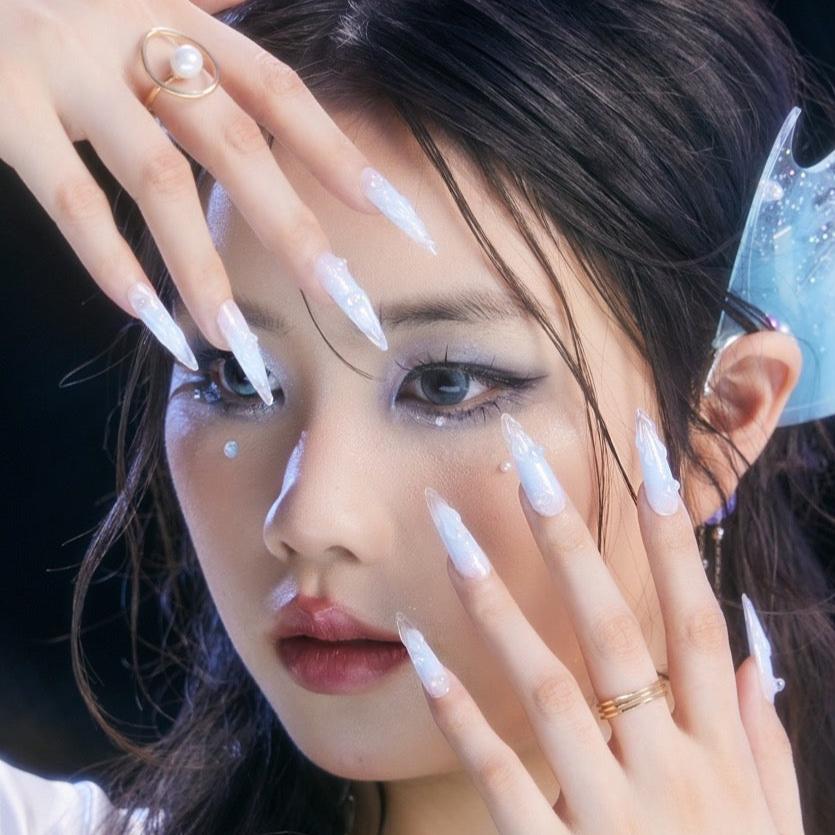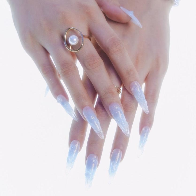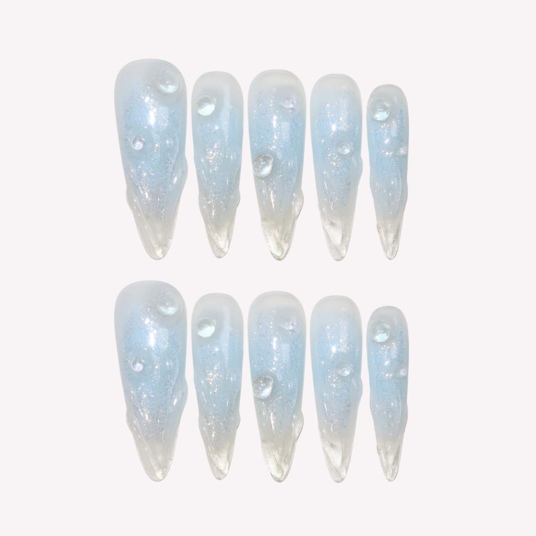 Immerse yourself in the serene beauty of Swara 's Glacial Whispers. Each nail is a sculpted work of art, reminiscent of the purest ice formations found in the heart of winter's embrace. The translucent tips glisten with embedded glitter, like the first frost's delicate kiss under the moonlit sky. Echoing the calm and poise of icy realms, these nails are crafted for those who carry the elegance of a winter queen. Glacial Whispers is a celebration of Ersa's dedication to capturing the essence of nature's wonders in our luxurious, handcrafted designs. Adorn your hands with this set and let the silent beauty of winter speak volumes.