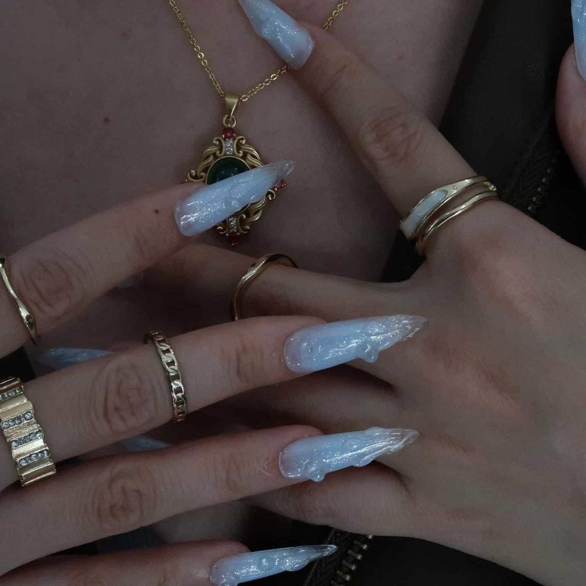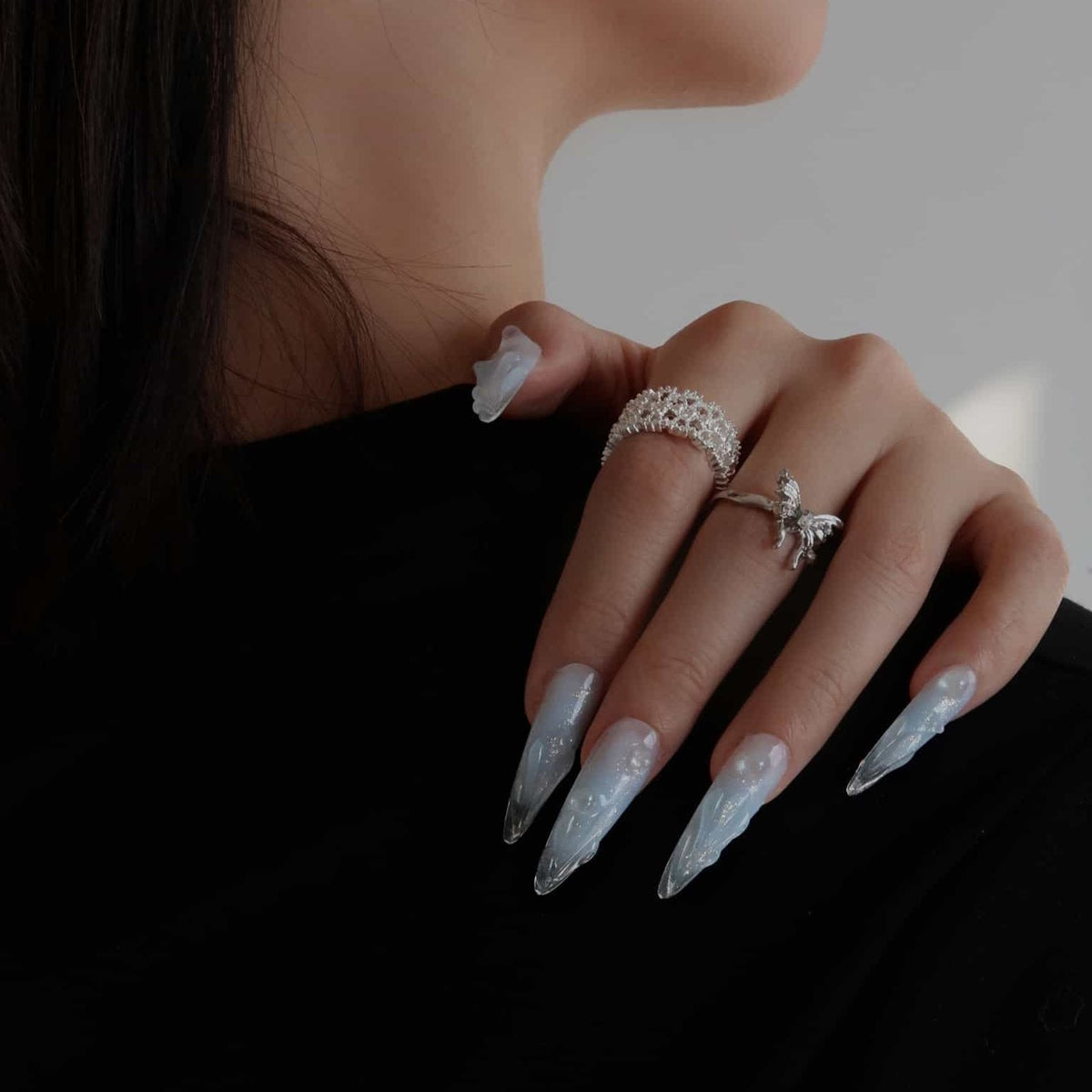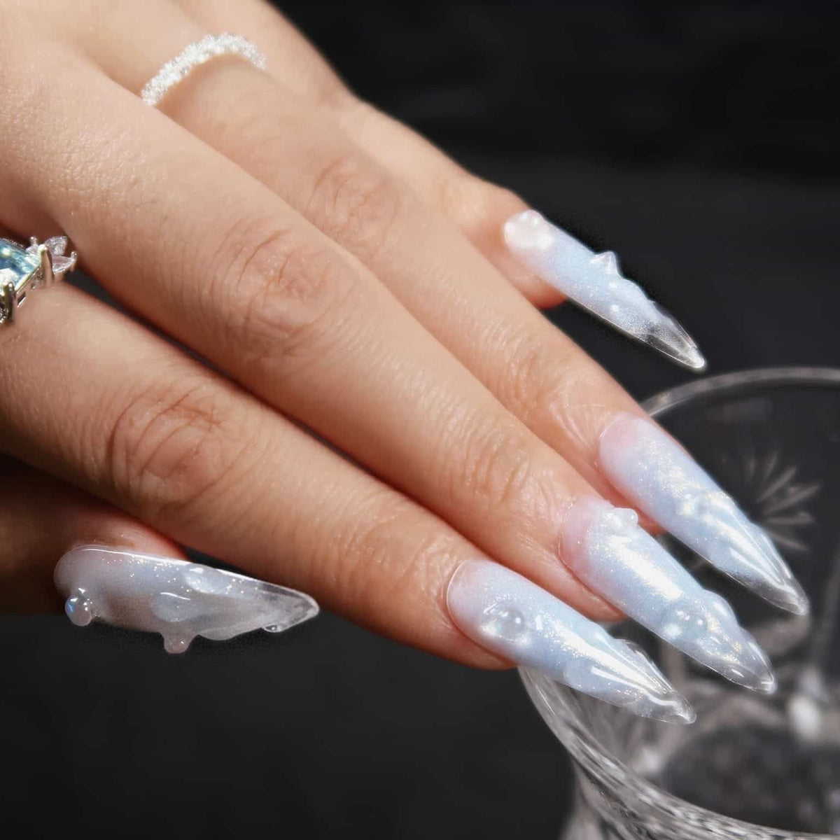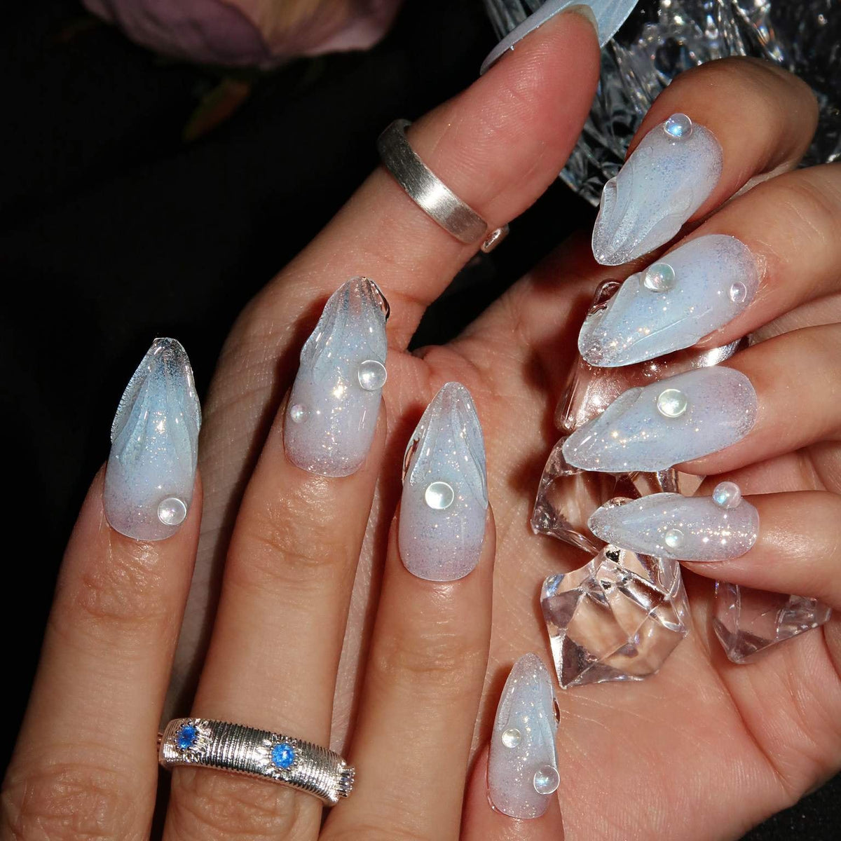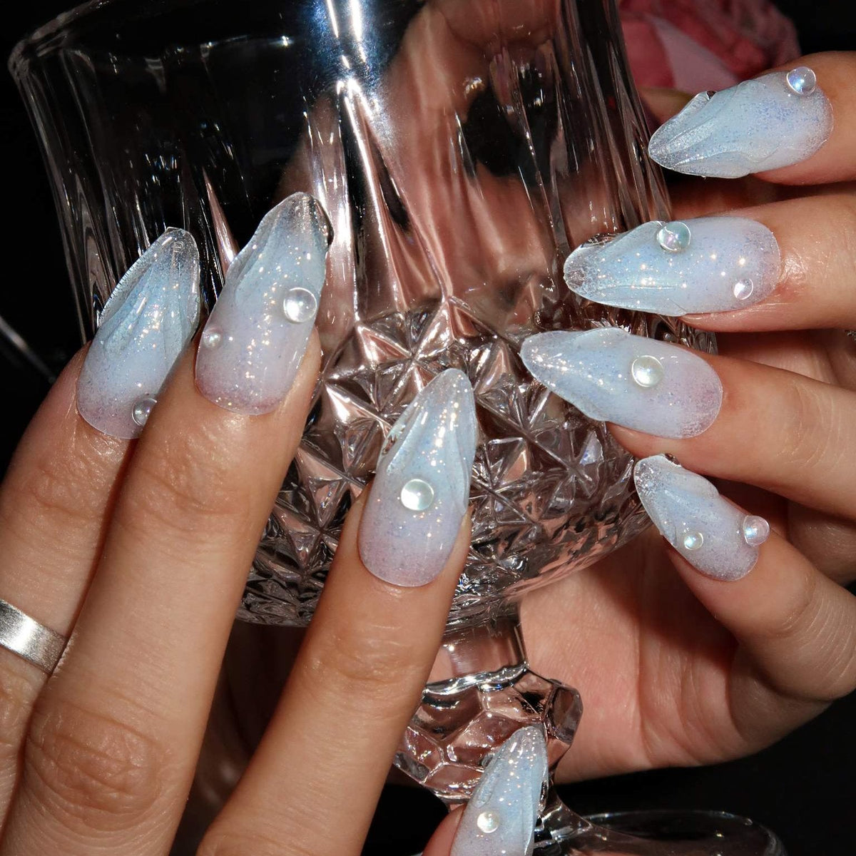 Immerse yourself in the serene beauty of Swara 's Glacial Whispers. Each nail is a sculpted work of art, reminiscent of the purest ice formations found in the heart of winter's embrace. The translucent tips glisten with embedded glitter, like the first frost's delicate kiss under the moonlit sky. Echoing the calm and poise of icy realms, these nails are crafted for those who carry the elegance of a winter queen. Glacial Whispers is a celebration of Ersa's dedication to capturing the essence of nature's wonders in our luxurious, handcrafted designs. Adorn your hands with this set and let the silent beauty of winter speak volumes.