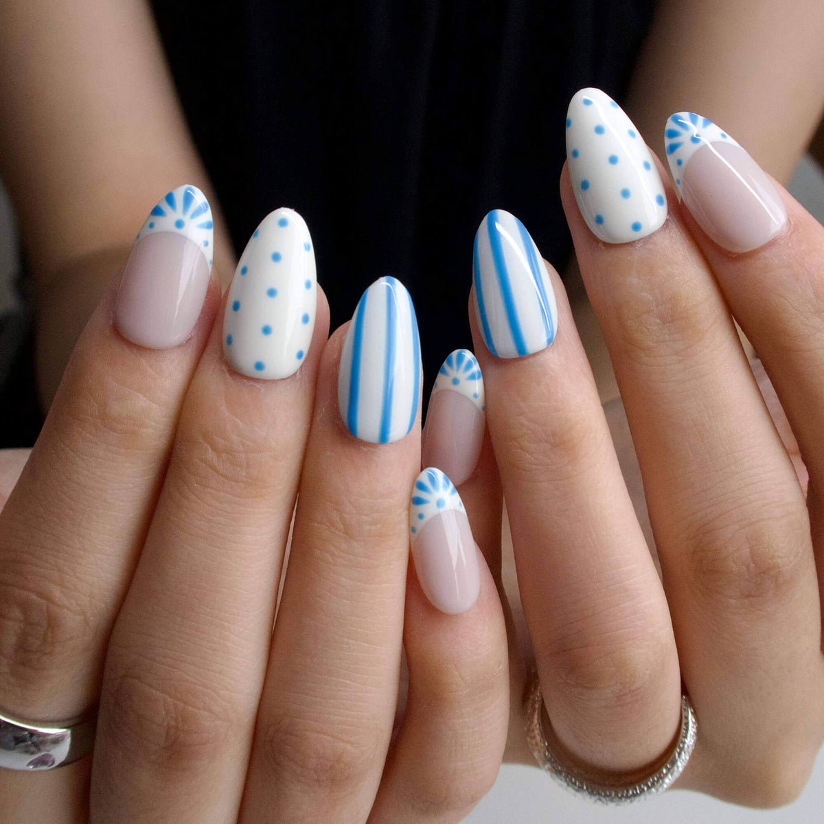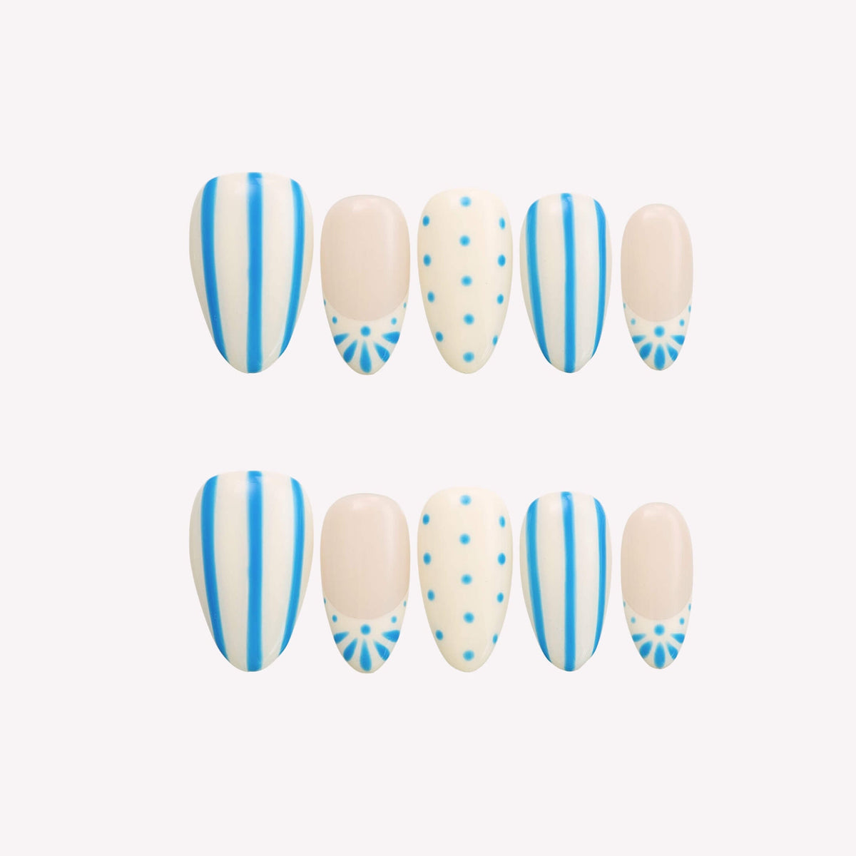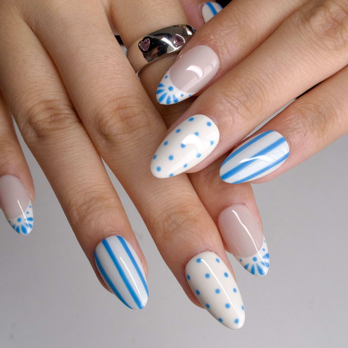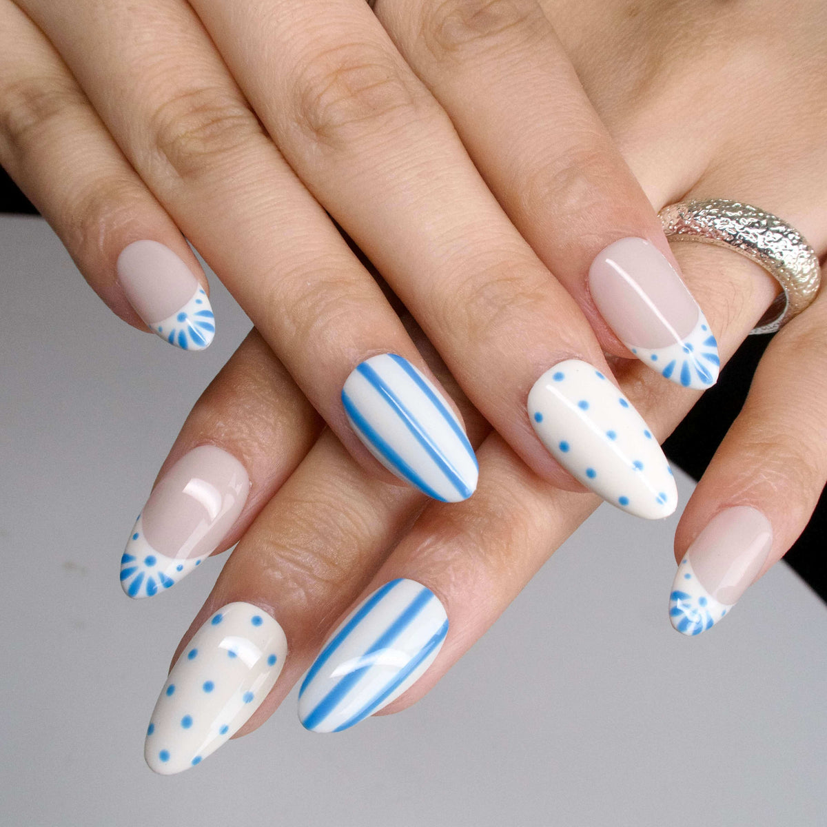Wavelet by tonails crafts a whimsical seaside story. On a soft cream canvas, crisp blue stripes dance alongside dotted motifs, while delicate fan - like details peek from nail tips. The muted blue - and - white palette mirrors the gentle rhythm of ocean ripples and the carefree charm of a beachside escape. Ideal for adding a touch of nautical minimalism to daily outfits or coastal getaways—pair with linen basics or white espadrilles for an effortless, breezy vibe. NAIL SHAPE: Short Almond