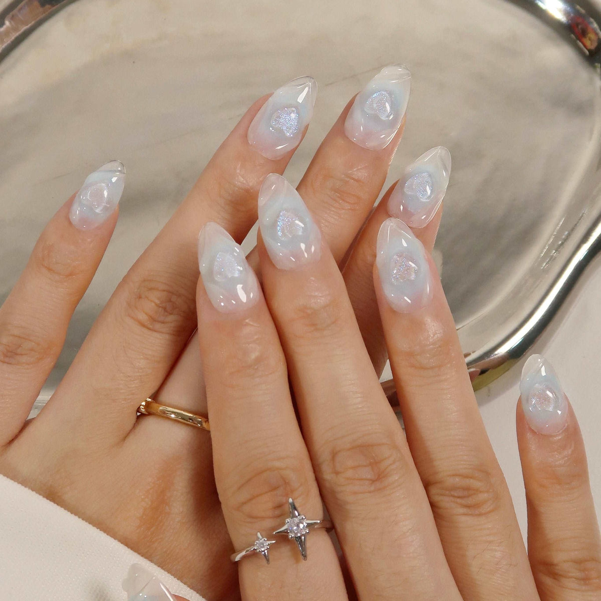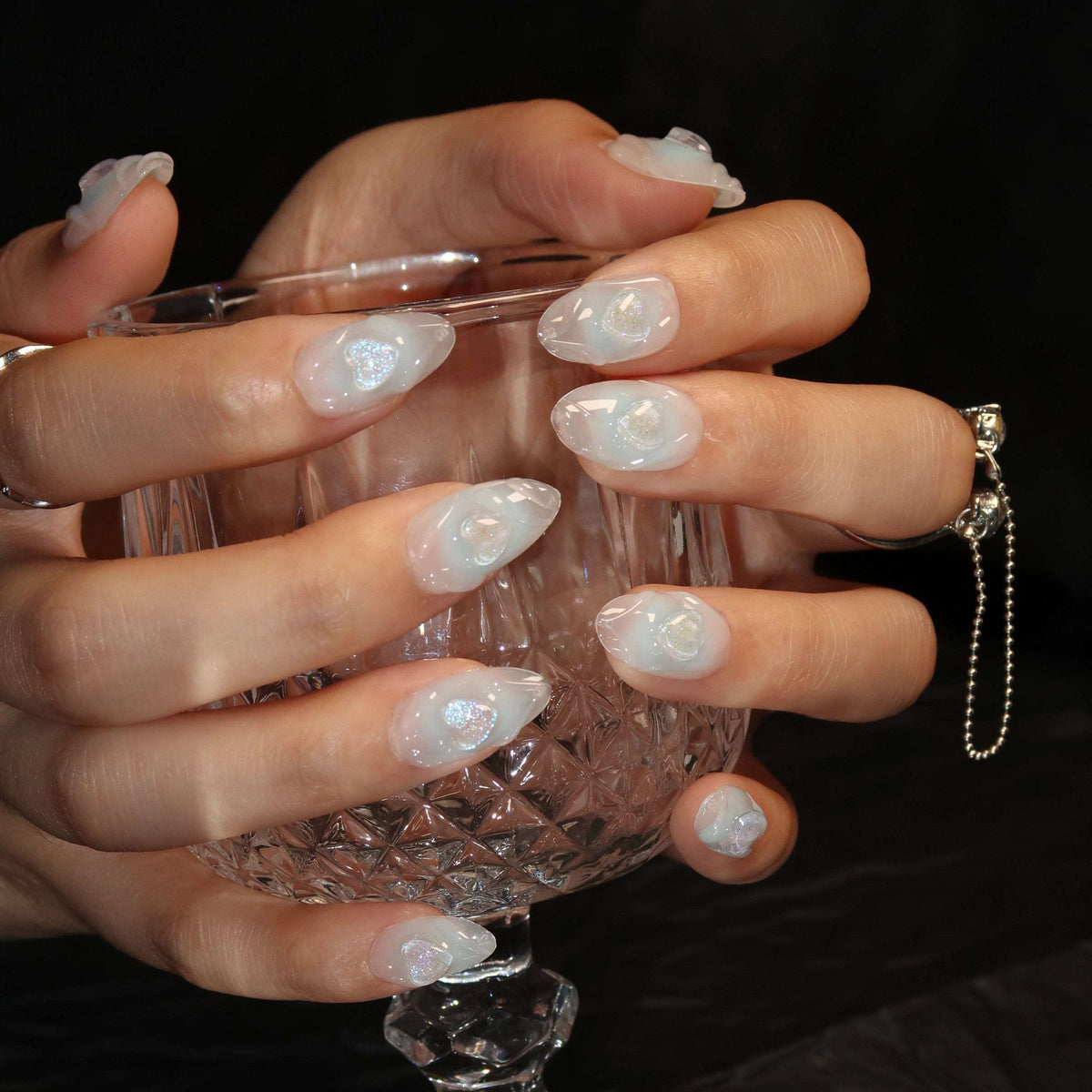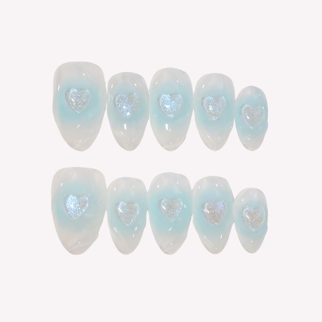 Unveiling Swara Nails' Blue Heart, an enchanting press-on set that mirrors the Sweetheart set in its whimsical charm yet tells its own story of azure affection. The nails are crowned with glittering heart accents, beckoningn the romantic tales of ancient folklore where love was written in the stars. Blue Heart marries the innocence of first loves with the depth of the fathomless sea, a perfect balance for those who carry the ocean within them and dream under the moonlit sky. Ideal for dreamers and romantics alike, Blue Heart transforms your nail game into a poetic saga of serene love, as timeless as the tides and as touching as a whispered promise.