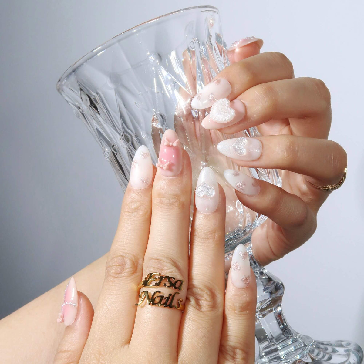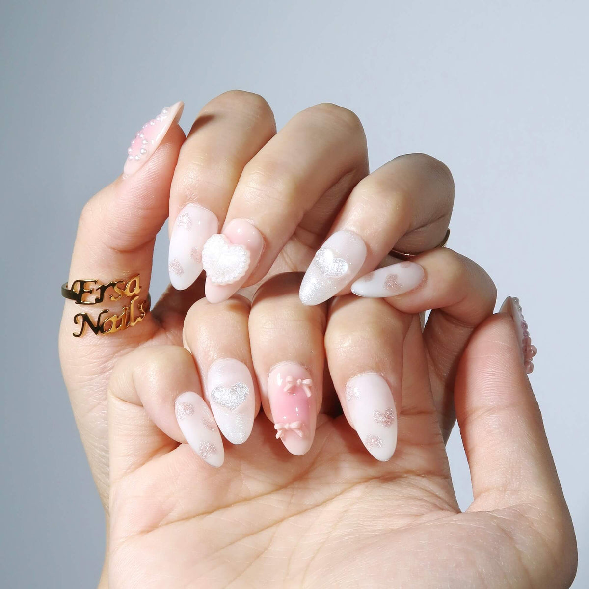 Embrace the softness of love with Cherished Heart by swara Nails, a delicate press-on nail set that radiates warmth and charm. Featuring a beautiful pink and white color palette, the soft pink aura design creates a dreamy effect, while heart patterns and exquisite pearl, heart, and bow embellishments add a touch of elegance. Perfect for those who cherish the beauty of sweet, heartfelt moments.