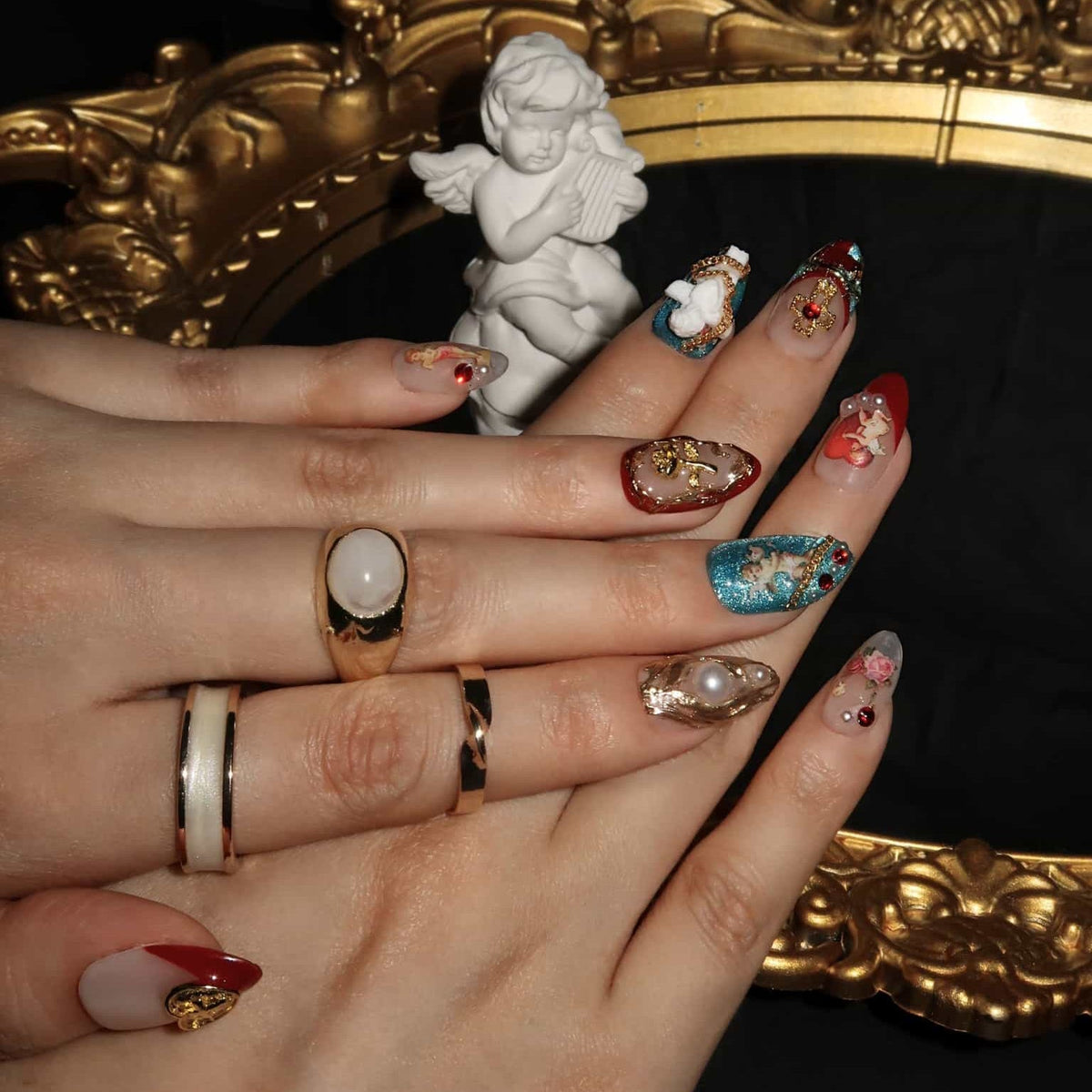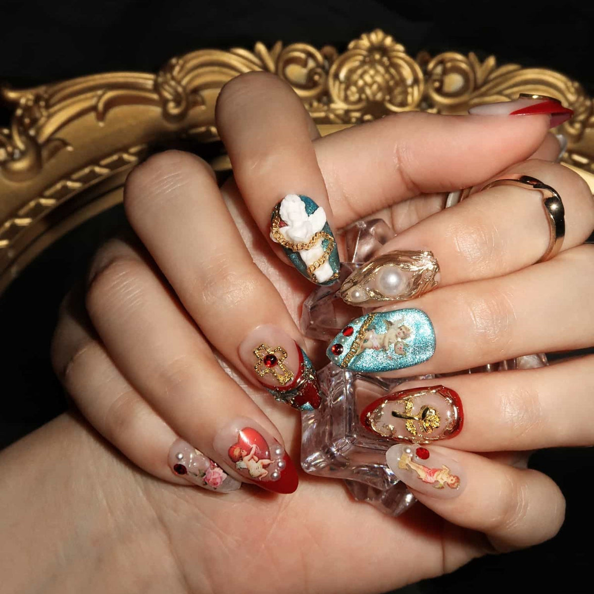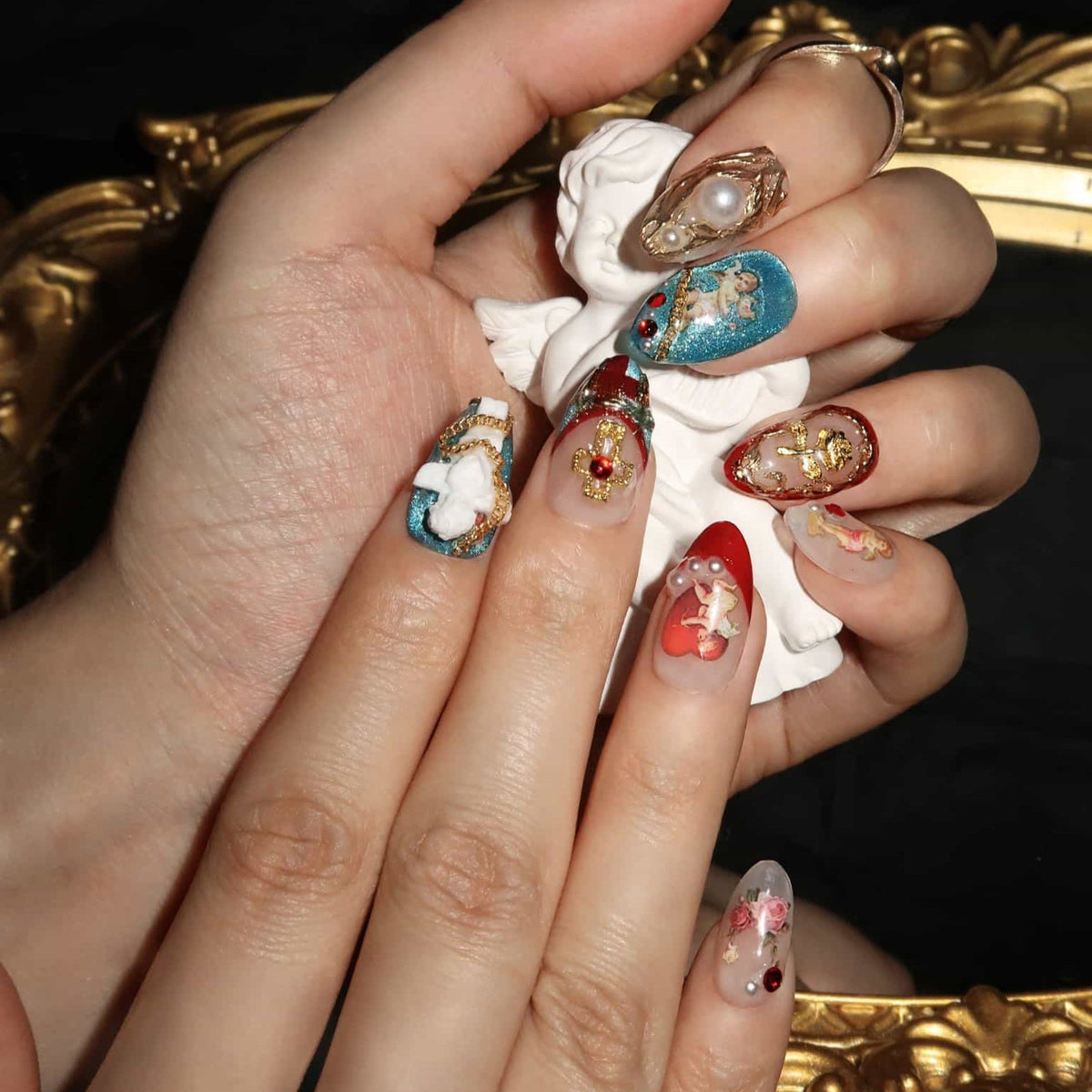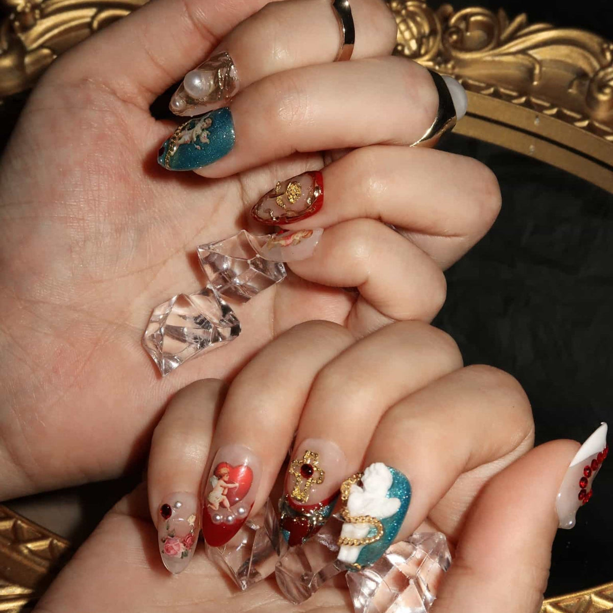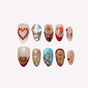 Introducing Faithful, a nail set from swara Nails that evokes a sense of enduring elegance. Each press-on nail is an emblem of commitment, adorned with symbols that resonate with unwavering belief and trust. With accents that range from subtle to bold, this set is perfect for those who carry their convictions with pride and wish to express their steadfastness through their style. The Faithful set is not just a fashion statement, it's a personal testament to the values held dear, making it more than just an accessory—it's a declaration.
