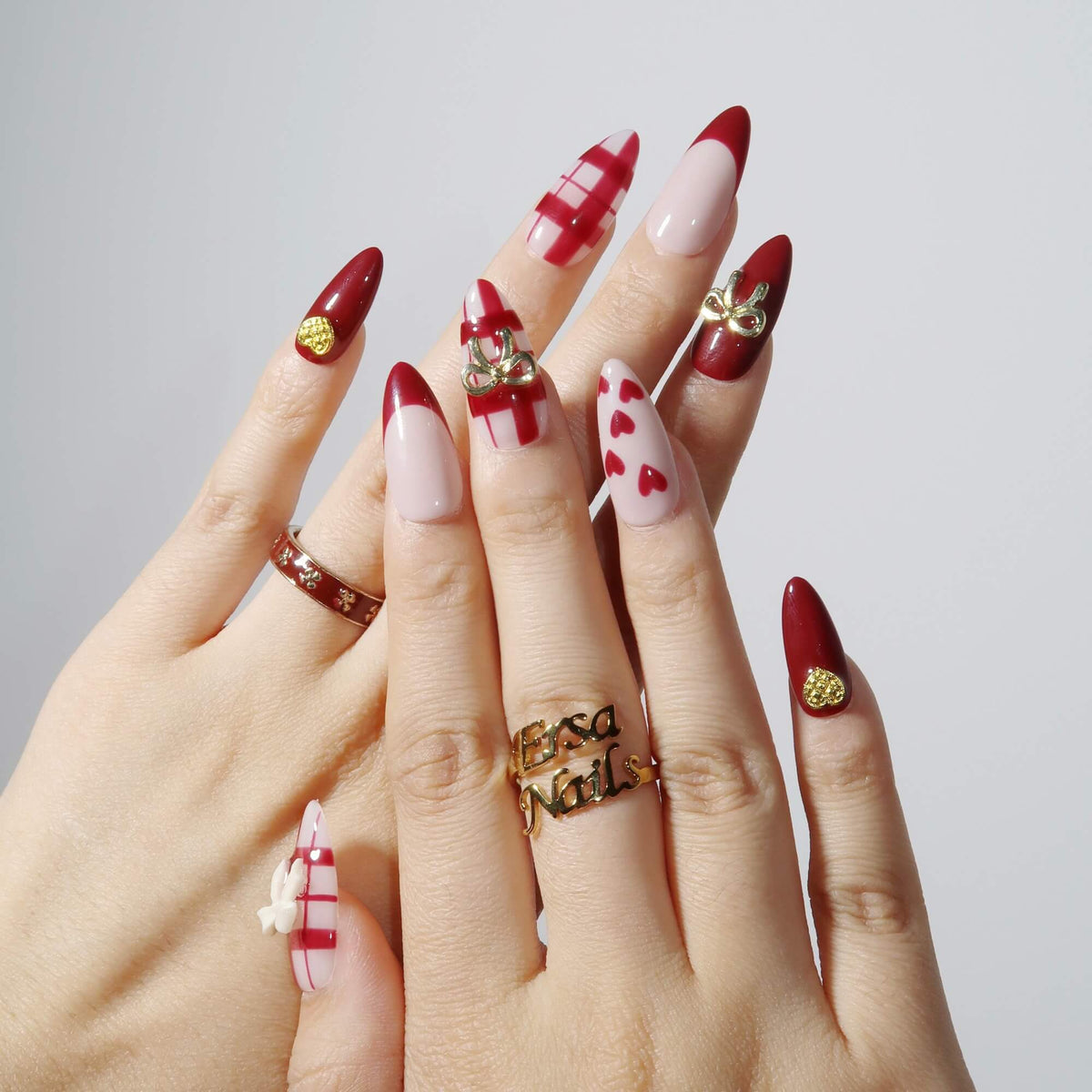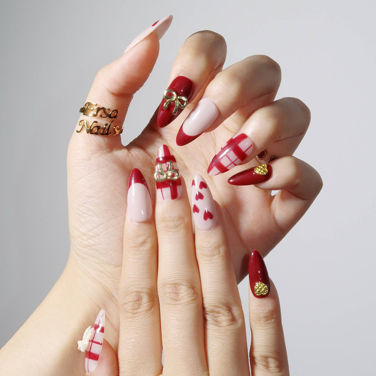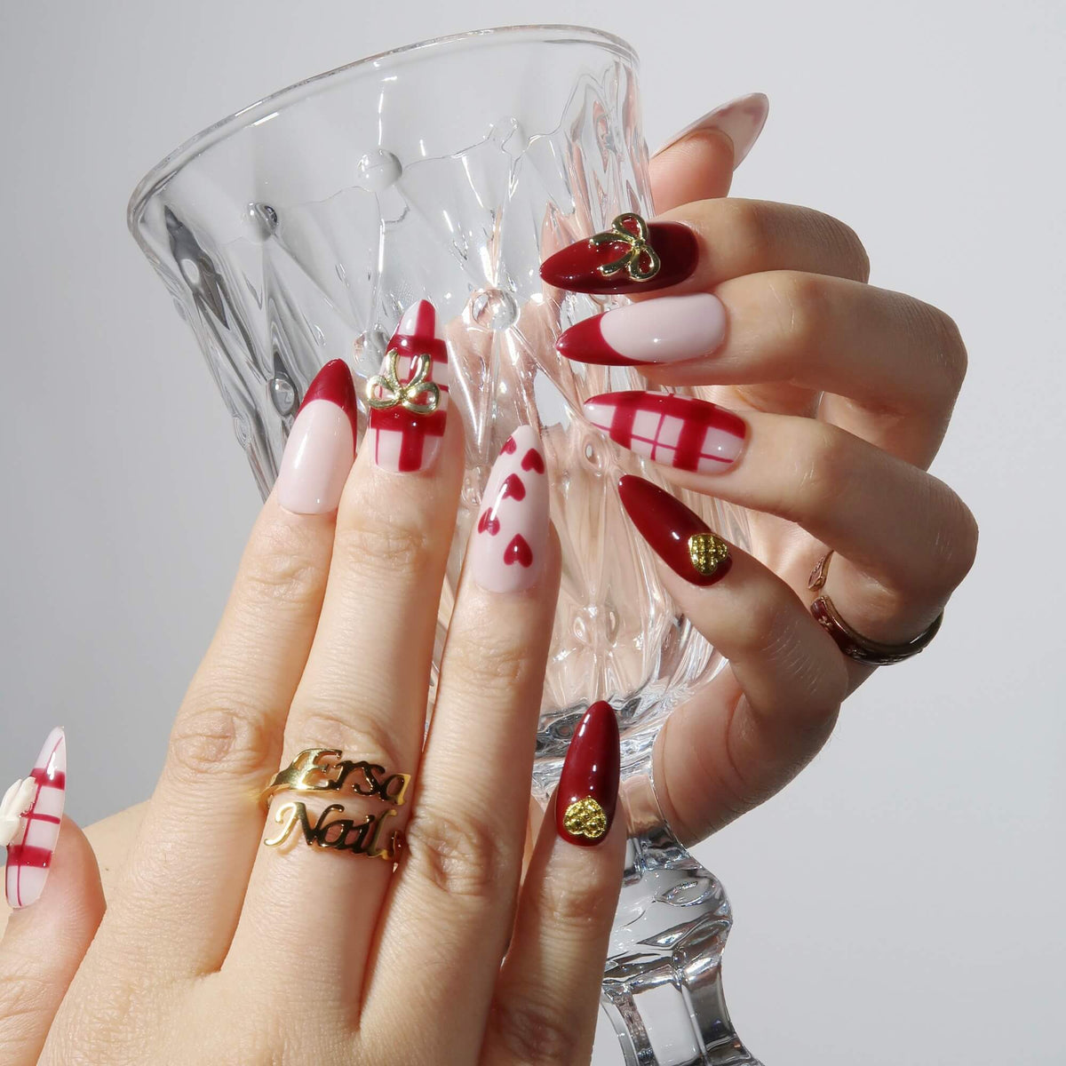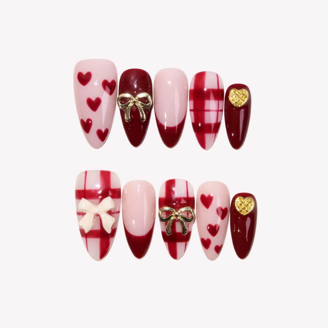 Celebrate love with Love Actually from swara Nails, a perfect choice for your Valentine nails. This design features a blend of pink and red tones with a classic checkered pattern, complemented by heart motifs and 3D bow embellishments. Gold heart accents add a touch of elegance, making Love Actually the ideal expression of love and romance for this special season.