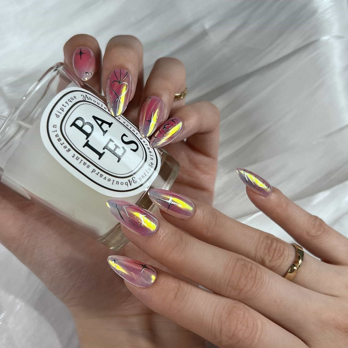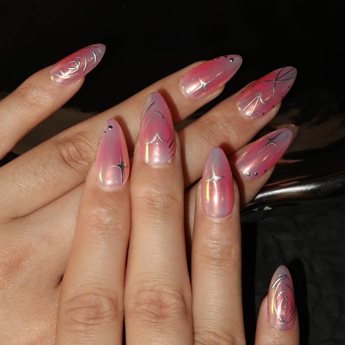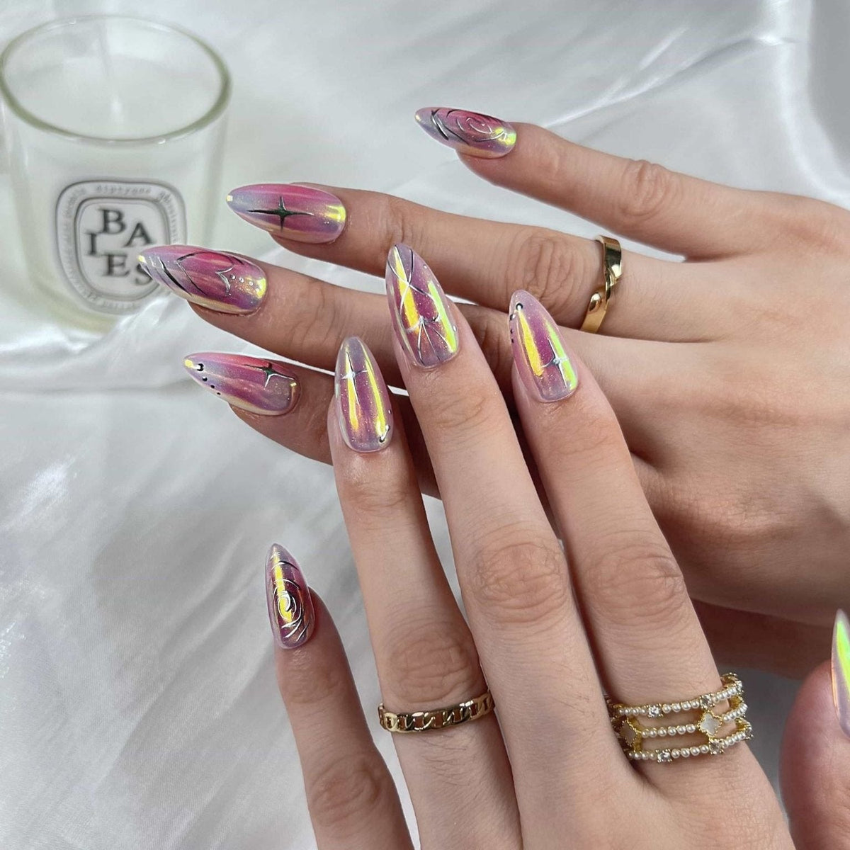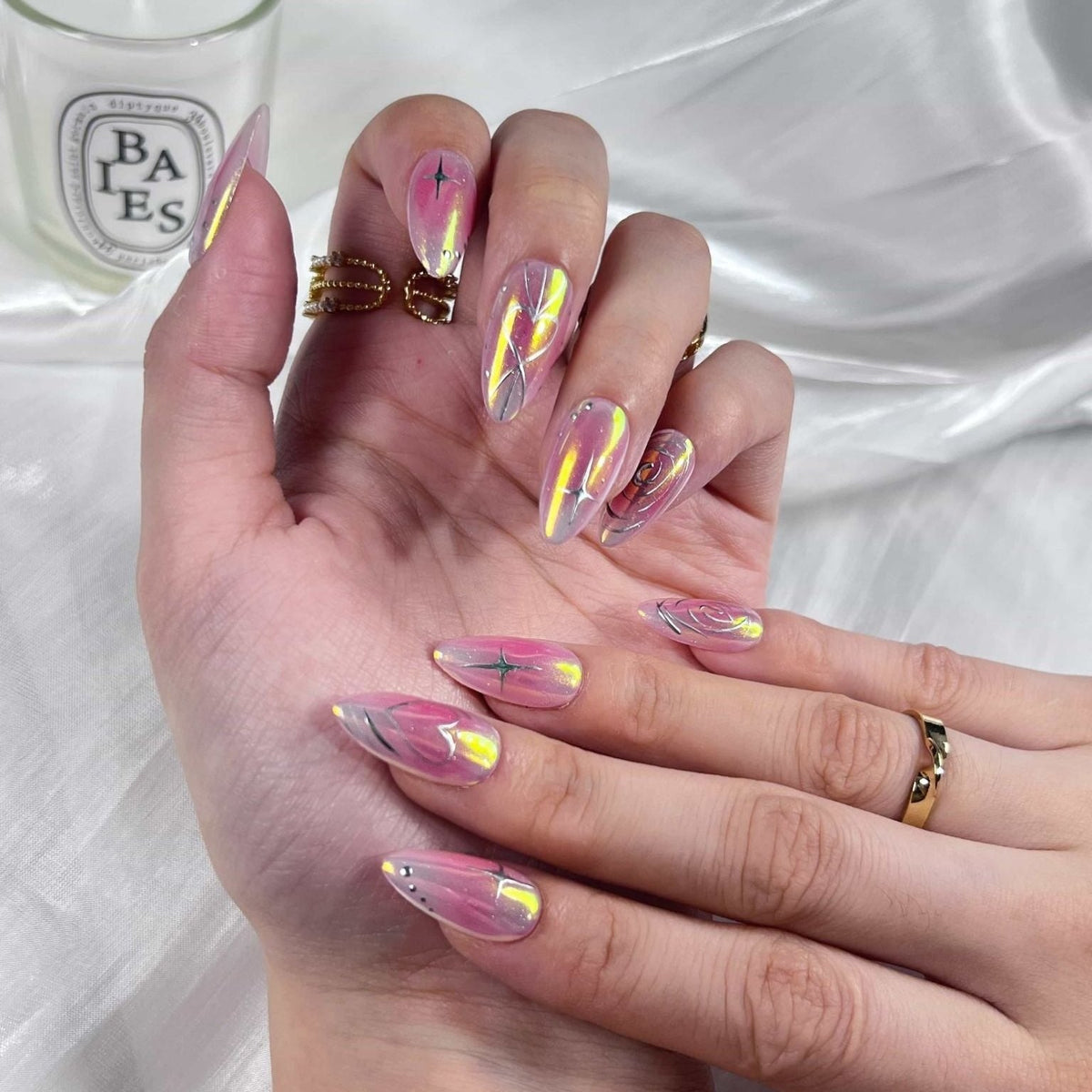 Introducing Swara 's Love Aura - a harmonious blend of dreamy pastels and captivating holographic hues. Each nails artfully captures the soft romance of twilight, complemented by holographic patterns that dance like the Northern Lights. Upholding Swara 's tradition of excellence and artistry, these nails evoke a sense of wonder, reminiscent of love's first light. Choose the Love Aura and allow your fingertips to narrate tales of ethereal beauty and mesmerizing charm. Experience the delicate blend of art and nature, all in the palm of your hand.