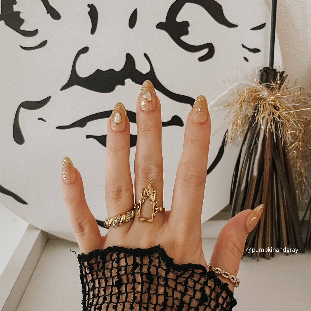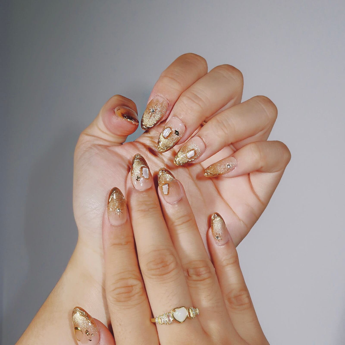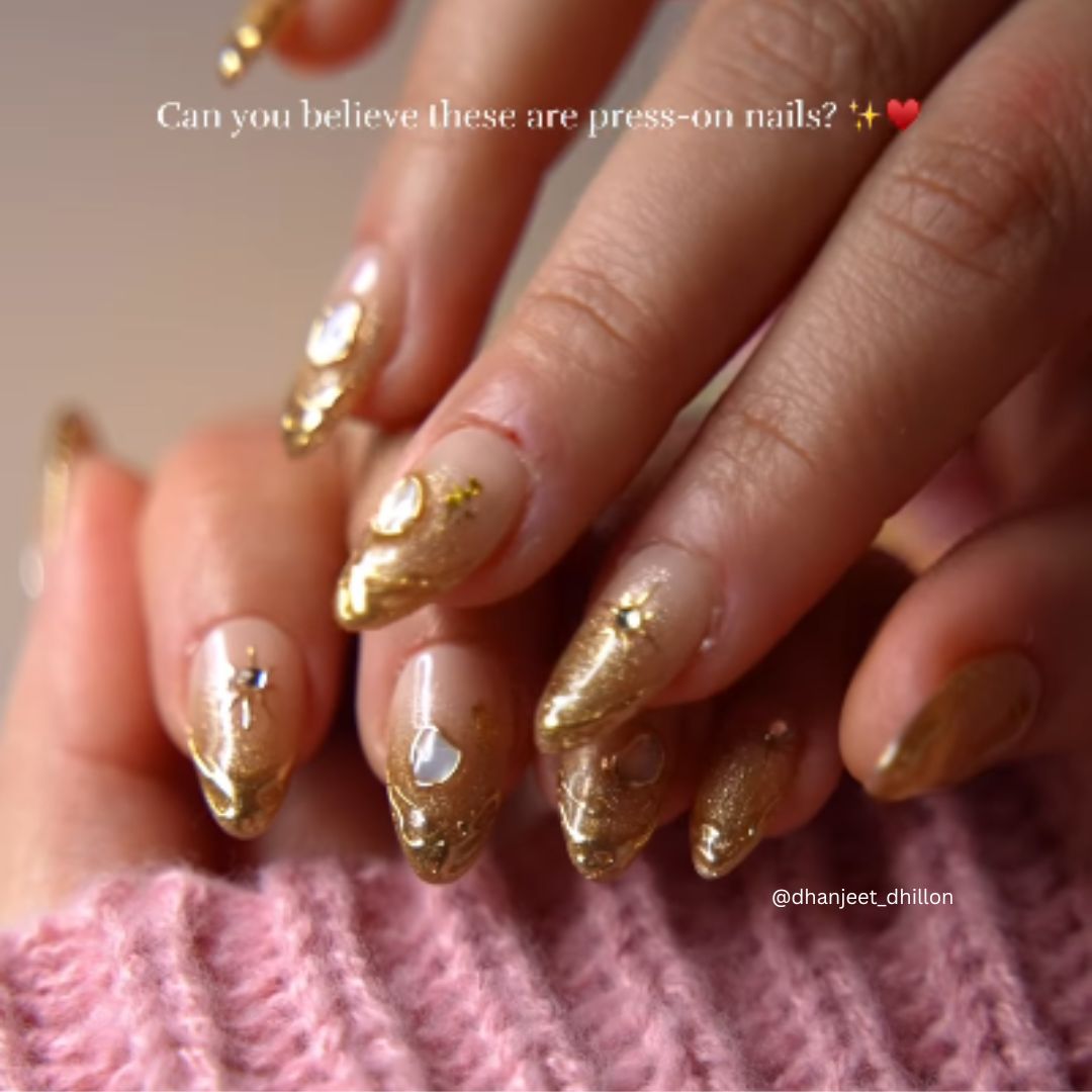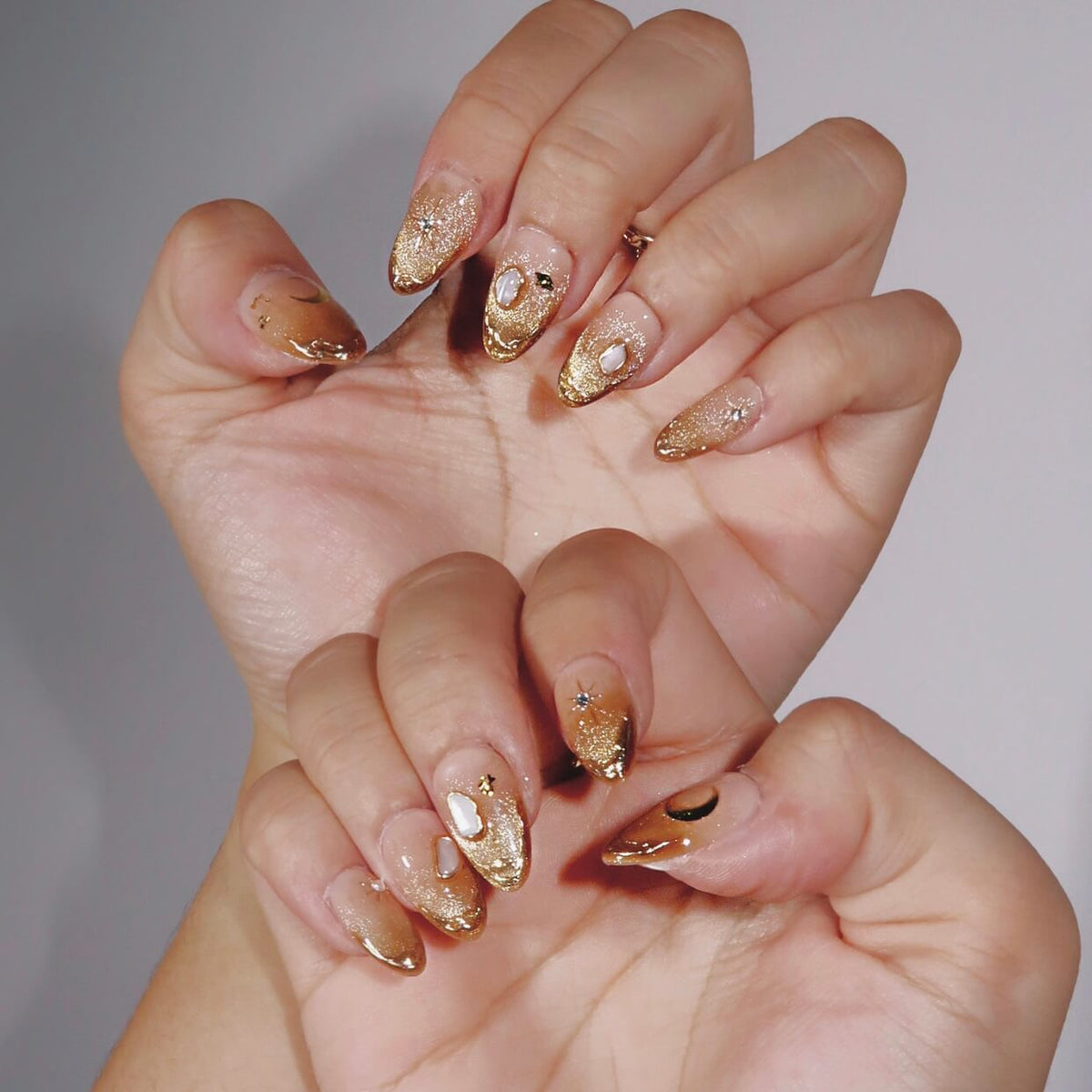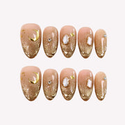 Indulge in celestial elegance with Shimmering Bliss from Swara Nails. This set features a nude base with irregular golden lines and a stunning gold glitter gradient at the tips, creating a shimmering effect. Delicate star and moon patterns add a touch of magic, while white shell accents complete the design with a hint of sophistication. Perfect for adding a dreamy, luminous finish to any look, Shimmering Bliss is your go-to choice for a glamorous, otherworldly manicure.
