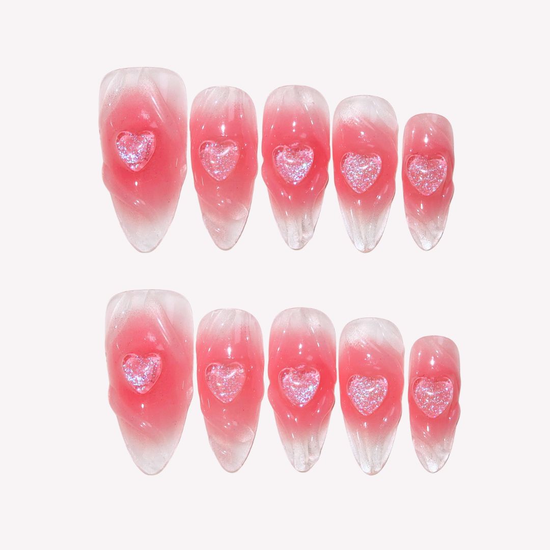 Sweetheart press on nails set is a romantic ode to love's tender touch. Soft pink swirls dance with glimmering glitter hearts, encapsulating the fluttering excitement of a first crush. These nails, with their translucent finish and delicate sparkle, are perfect for adding a whisper of romance to any ensemble. Whether for a date night or a self-care day, let your fingertips blossom with the sweet, enchanting allure of affection.