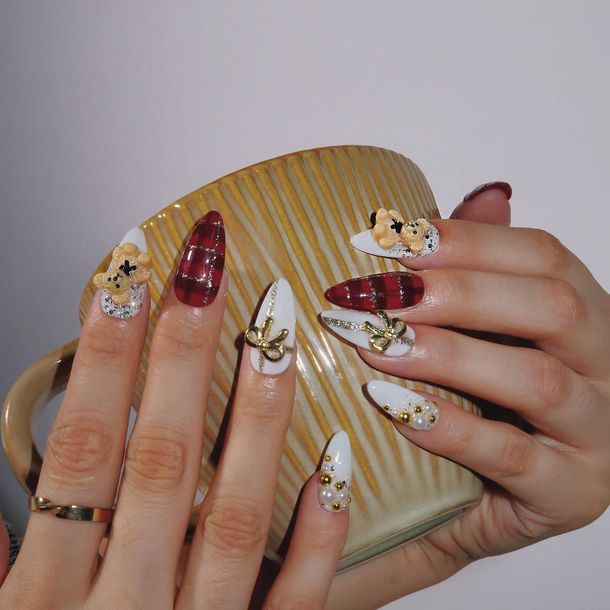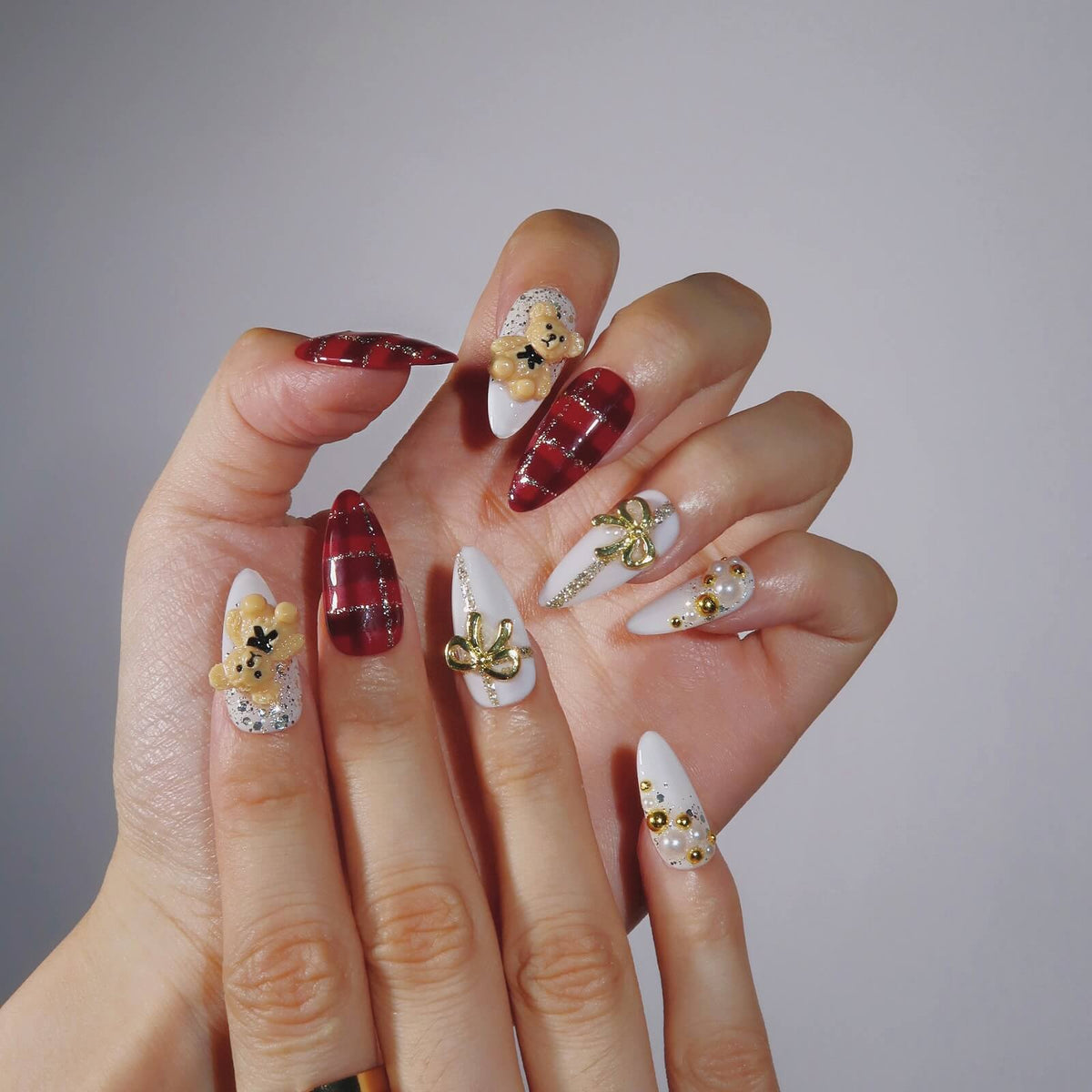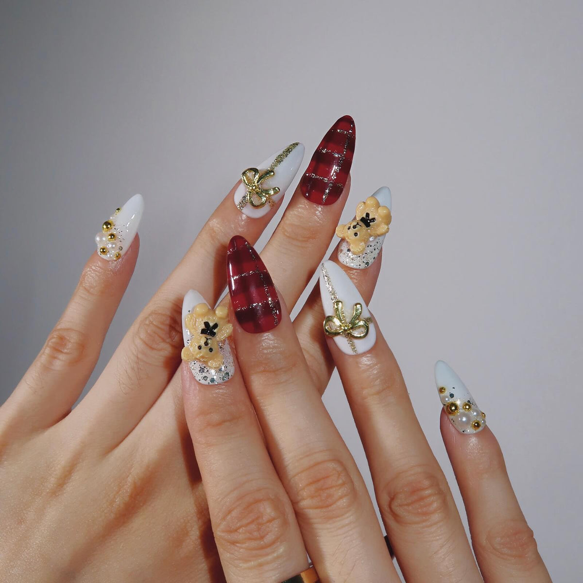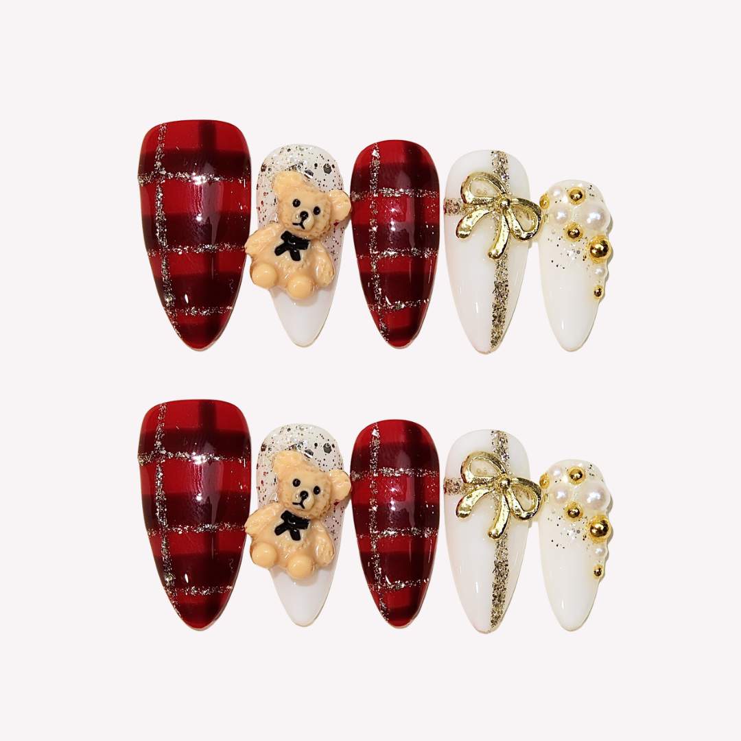 Teddy's Caress brings a playful yet festive charm to your nails with its bold red and white tones. The set features a striking red plaid design on the thumb and middle finger, while the index finger showcases a 3D teddy bear decoration for a whimsical touch. A delicate golden bow on the ring finger adds an elegant accent, making this set perfect for the holiday season. With its warm, joyful vibe, Teddy's Caress is a delightful way to celebrate in style.