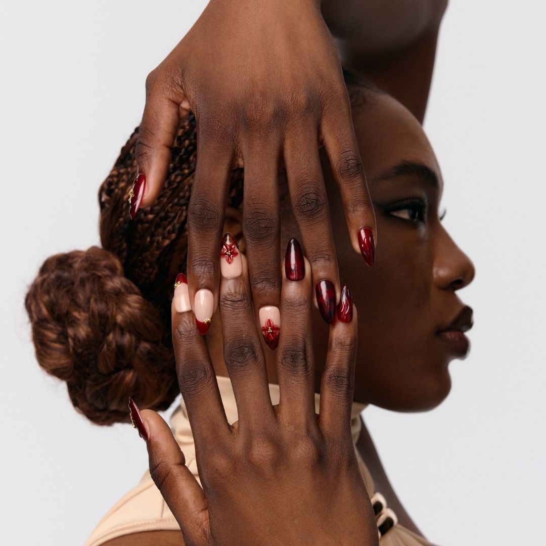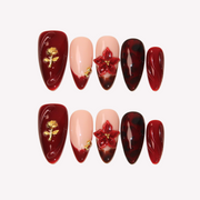Elevate your holiday season look with Velvet Rose by Swara Nails. This medium almond set is a sophisticated mix of rich red hues, gold accents, and elegant floral details that capture the essence of festive warmth. With intricate gold roses and bold 3D red florals, Velvet Rose is perfect for those who want to add a touch of glamour to their holiday ensemble. The deep, velvety tones make a statement, while the sleek almond shape ensures a classy, polished finish.