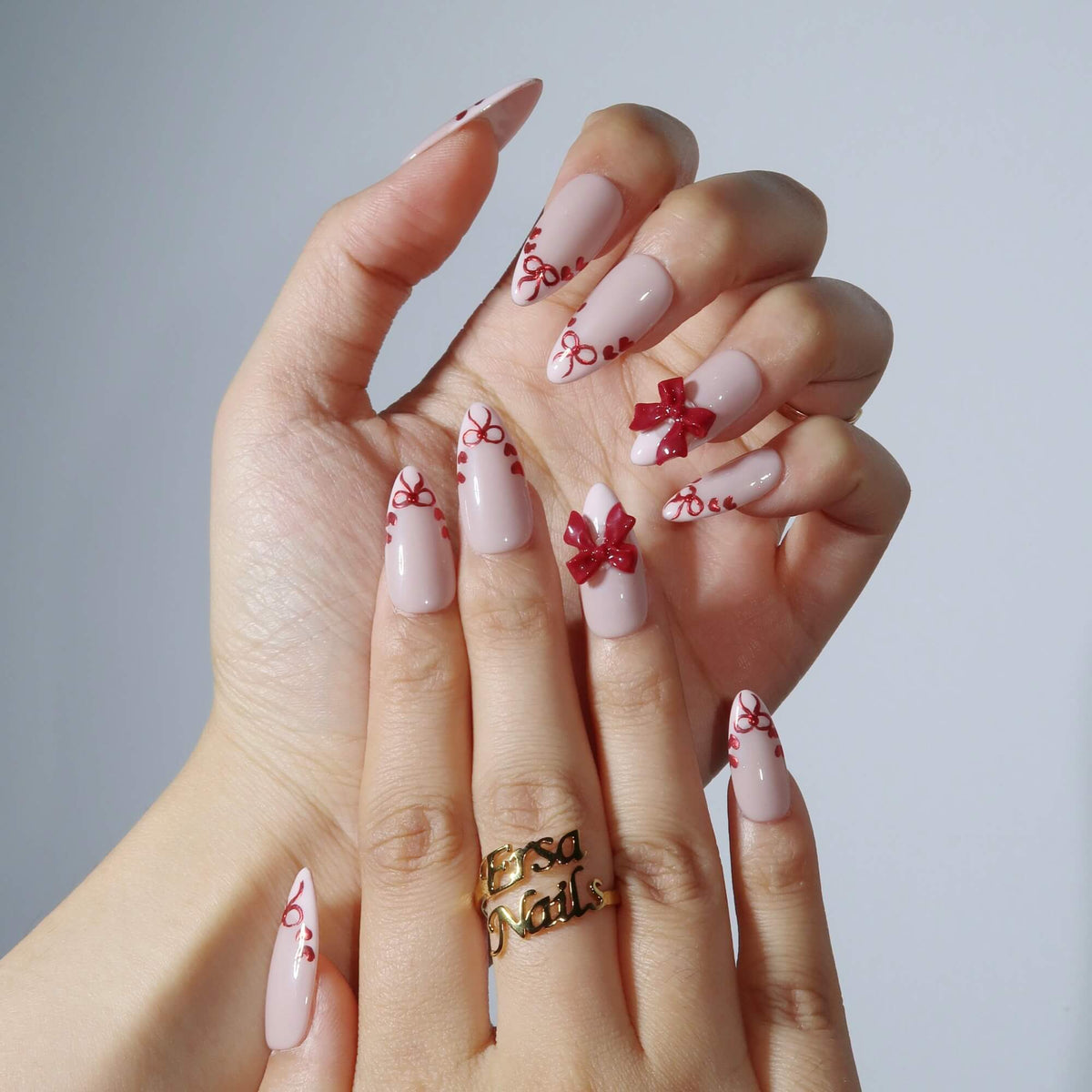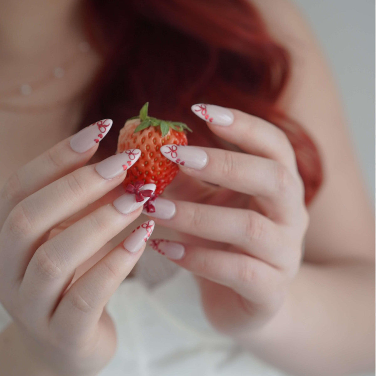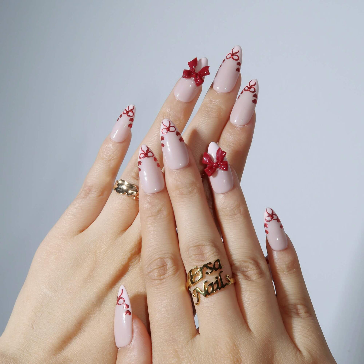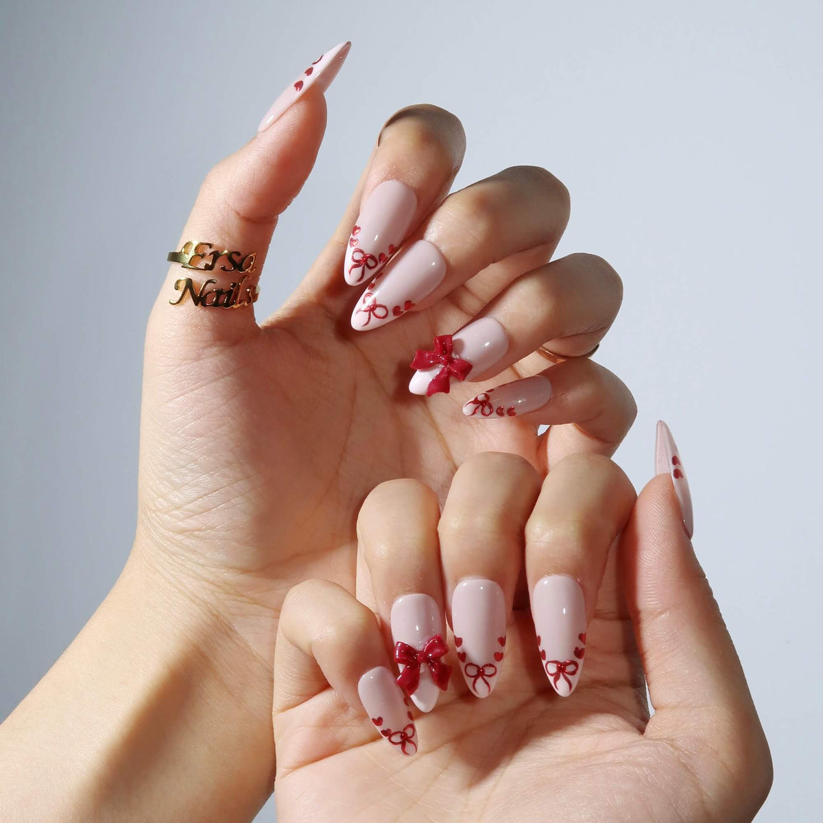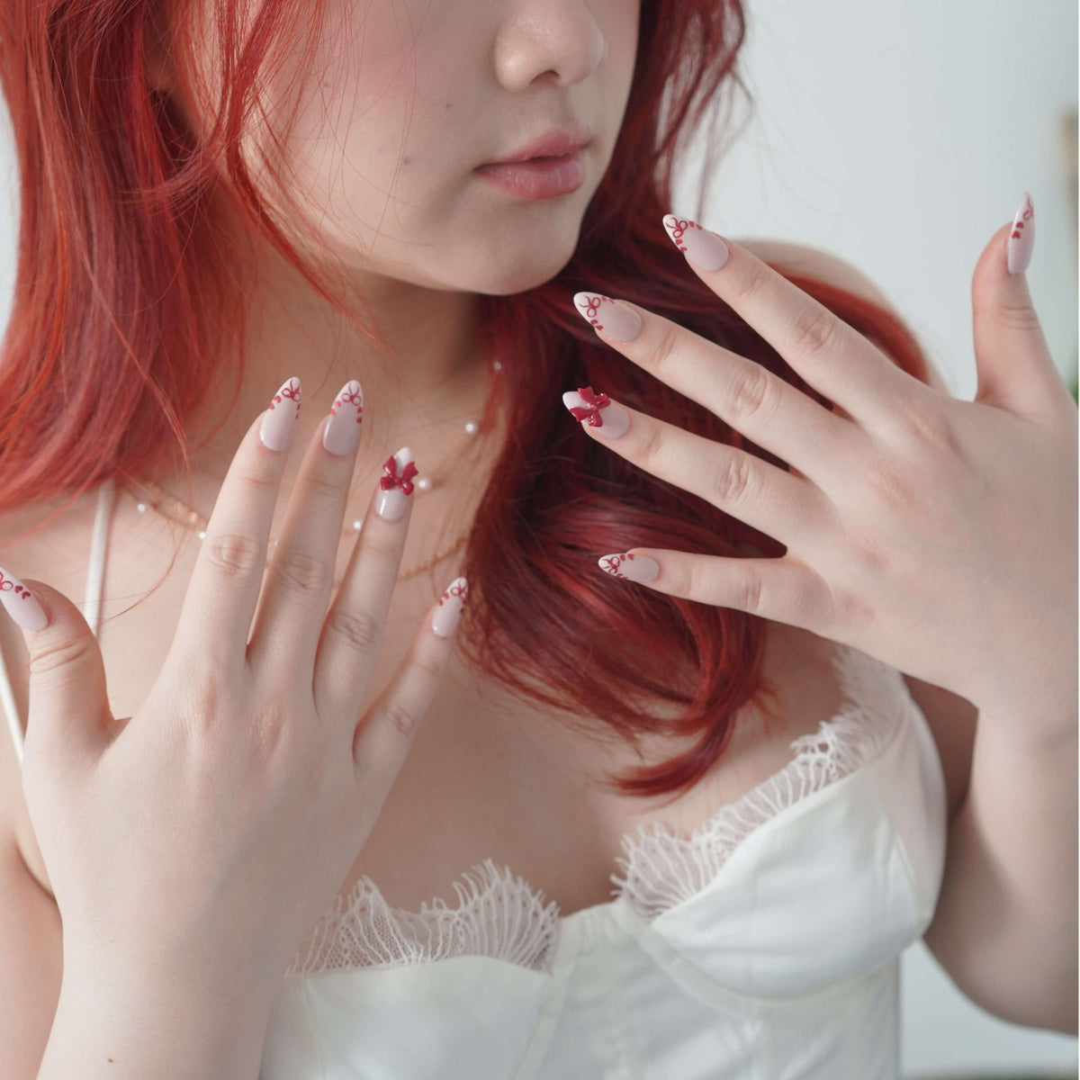 Fall in love with Be Loved by swara Nails, a sweet and elegant press-on nail set designed to capture hearts. The soft nude base features a classic French tip design, accented with tiny heart motifs along the edges for a touch of romance. Delicate bow illustrations add an extra layer of charm, while a 3D bow embellishment on the ring finger completes the look. Perfect for any occasion, Be Loved brings a subtle yet sophisticated flair to your nails, making you feel cherished and beautiful.