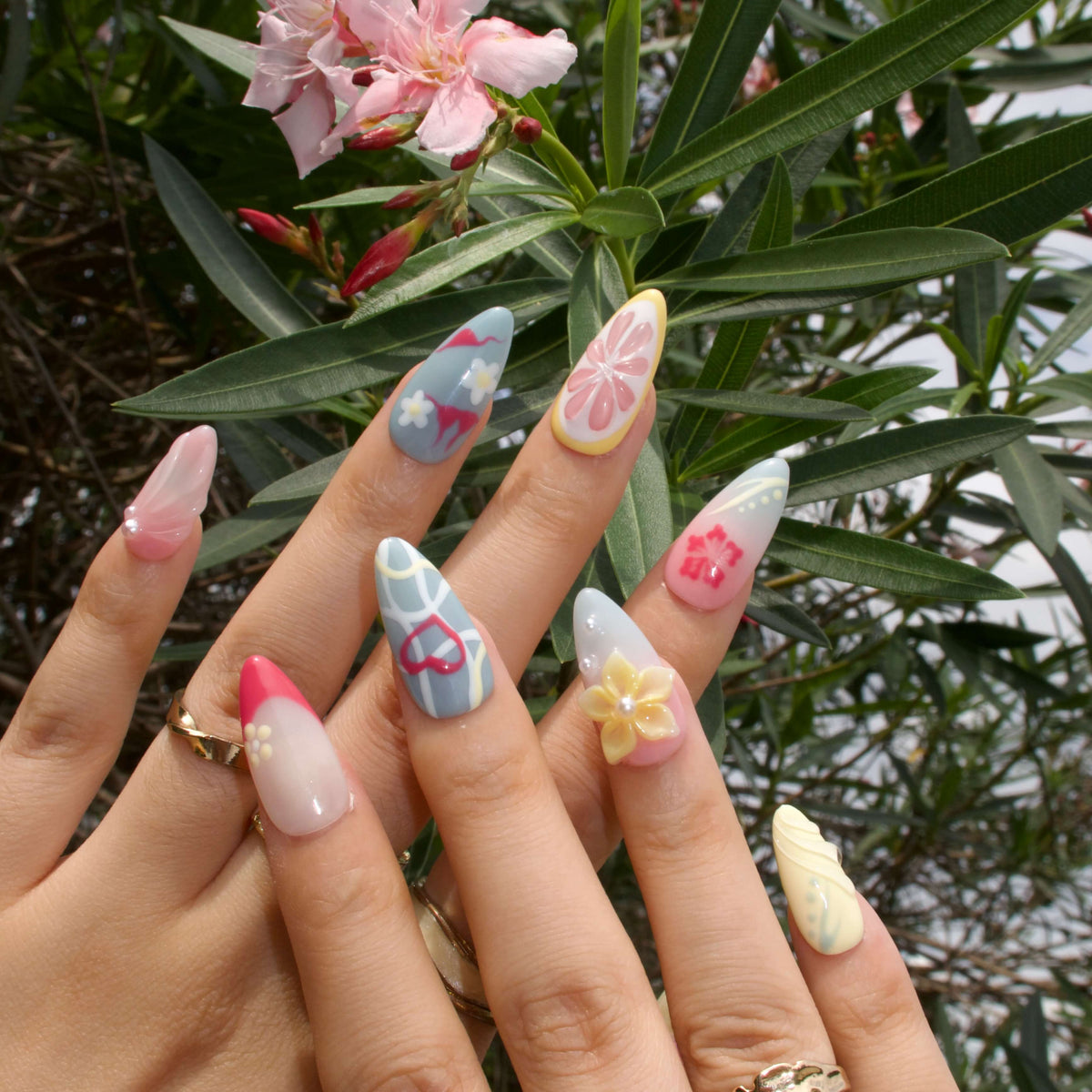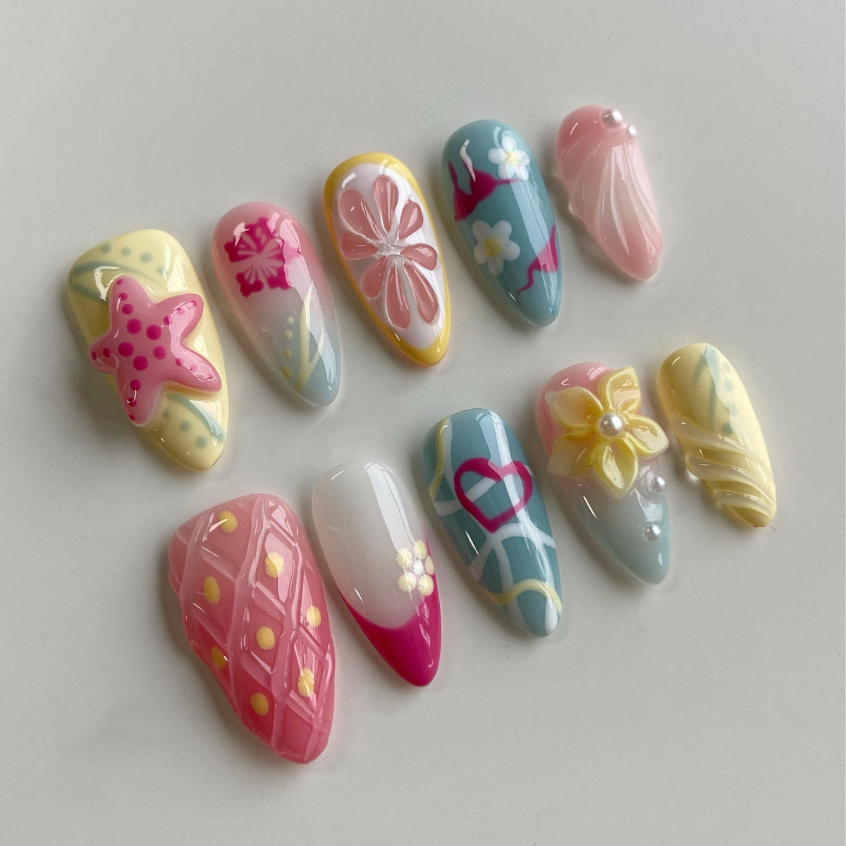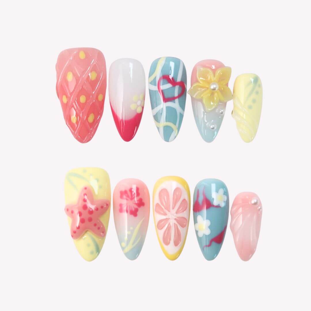 Beach It’s Time by swara Nails is your ultimate summer escape—right at your fingertips. These colorful press-on nails feature a playful mix of pink, yellow, and blue tones, adorned with fruity strawberry and grapefruit accents. 3D starfish and floral embellishments, plus a cheeky bikini design, bring beach-day vibes to life. Fun, fresh, and full of sunshine—this set is made for summer lovers.