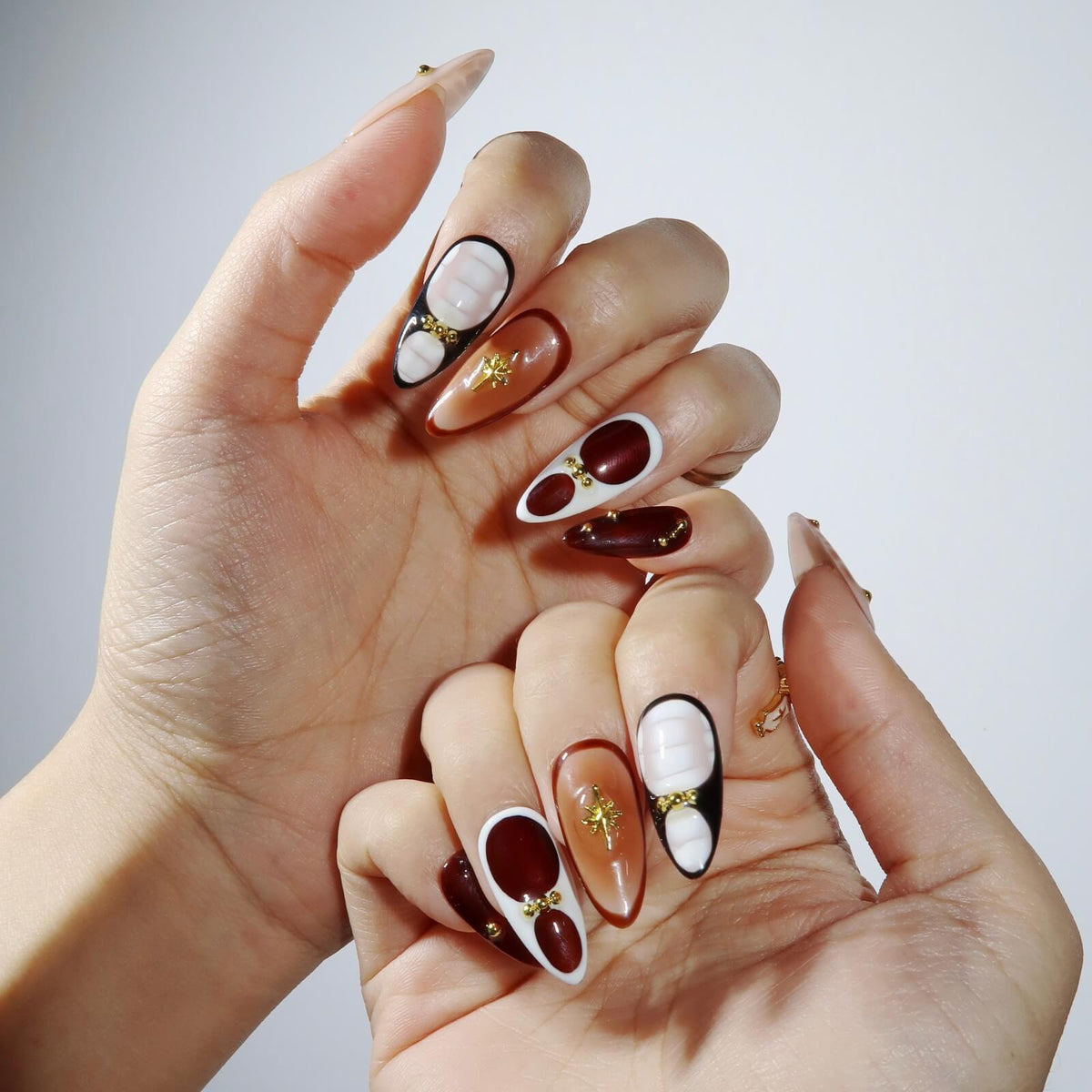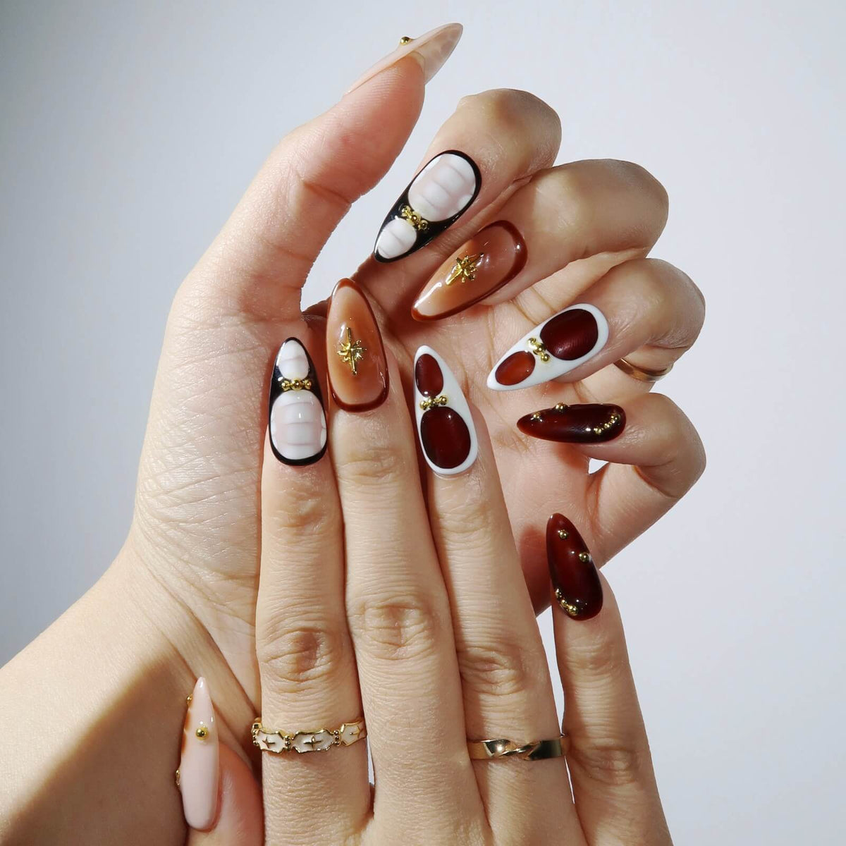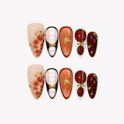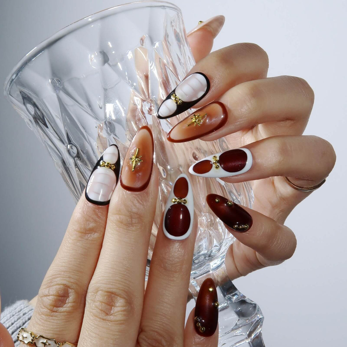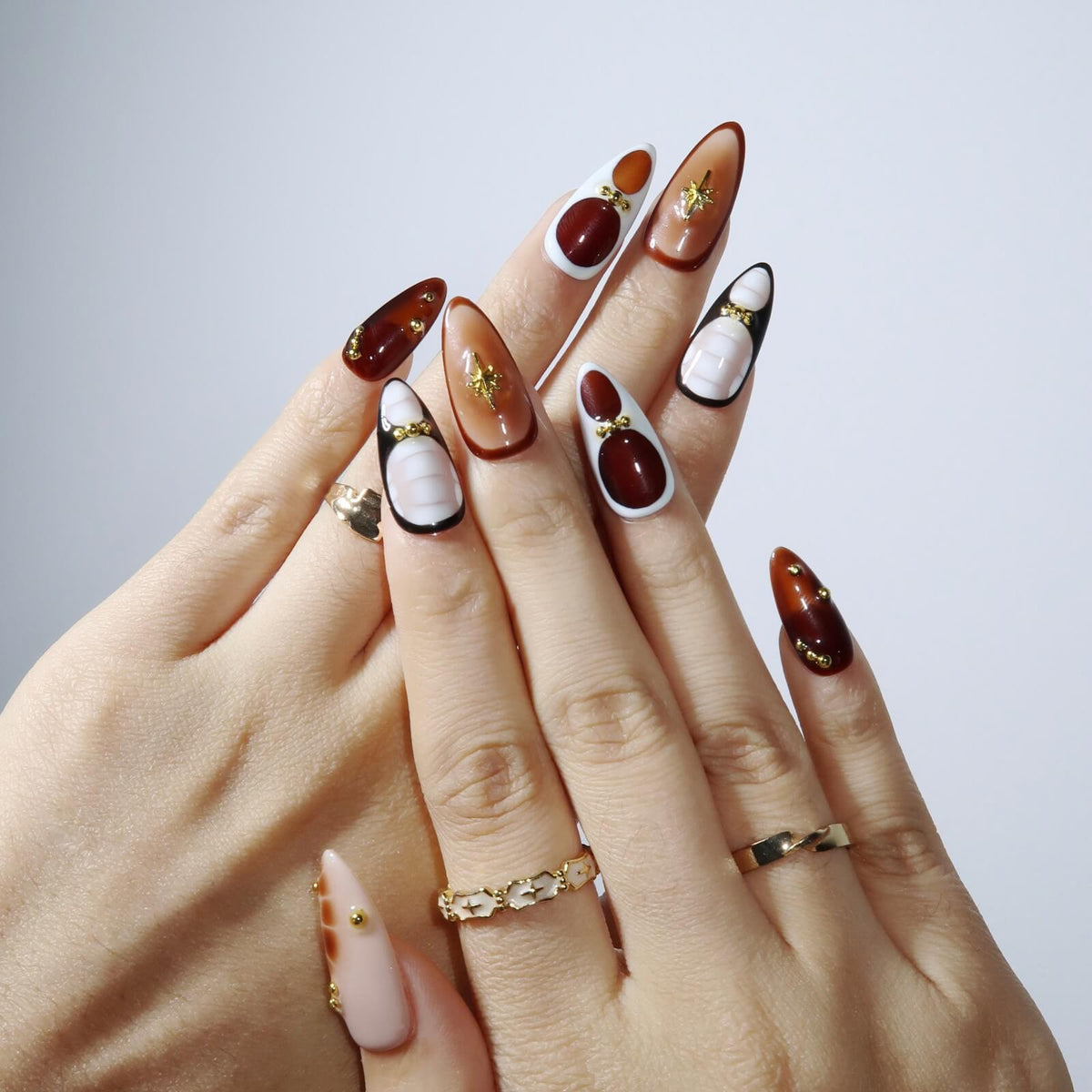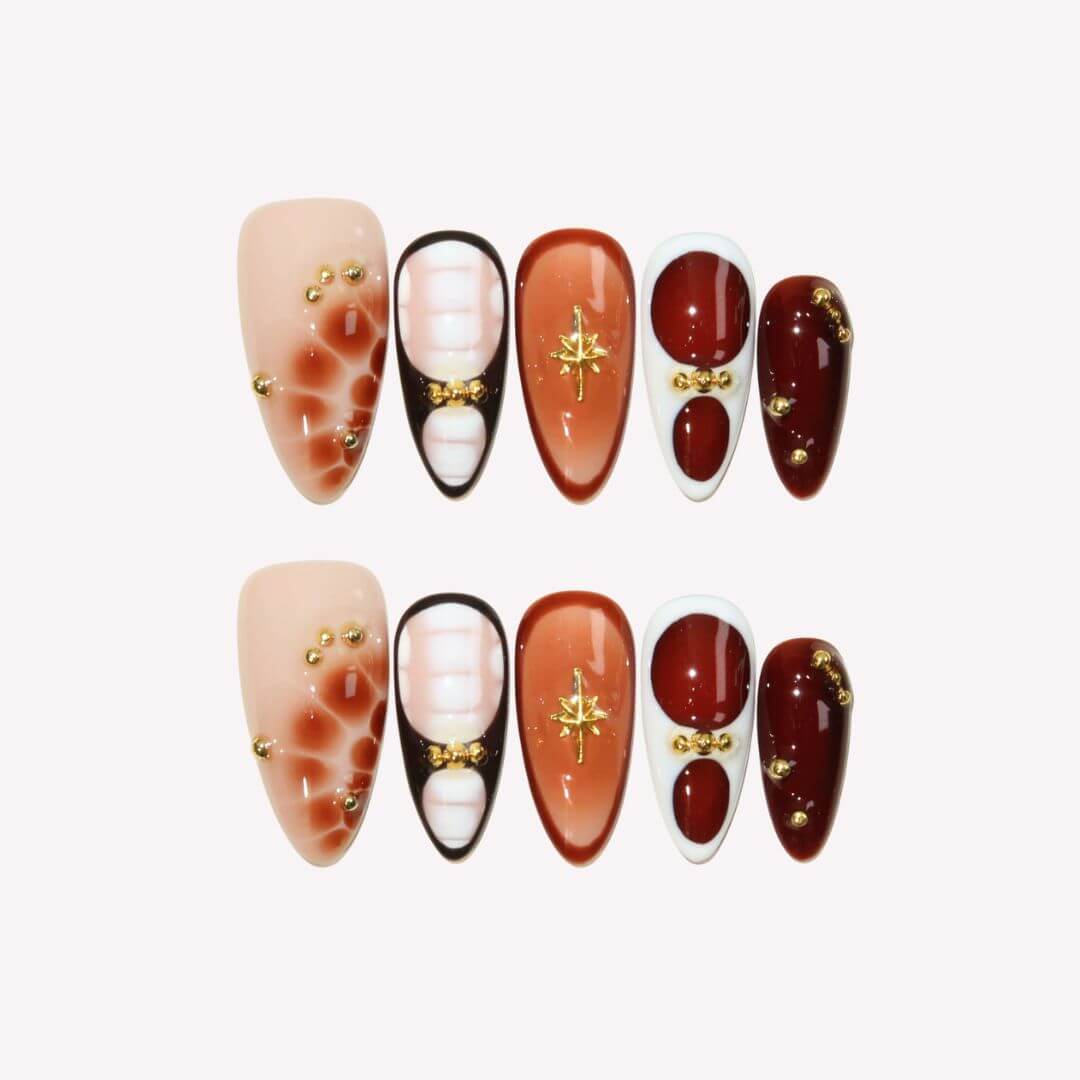 Indulge in the warmth of Caramel Ripple, a perfect blend of elegance and sweetness. This set features a rich brown base with a French tip design, beautifully enhanced by a soft brown and white ombré effect. Gold beads delicately adorn the nails, adding a touch of luxury and sophistication. Ideal for those seeking a refined, yet cozy look, Caramel Ripple is the perfect choice for any occasion.
