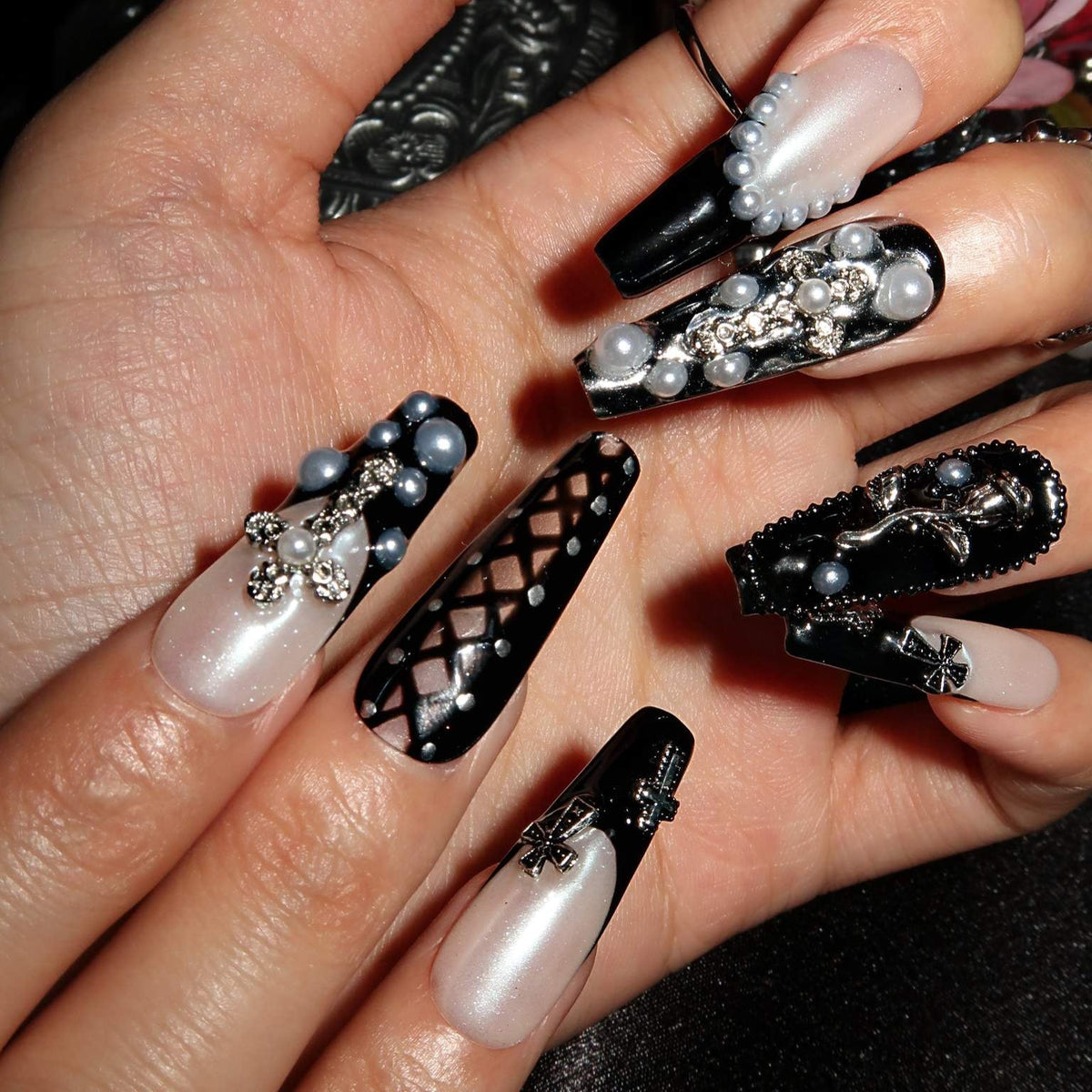 Embrace the sophistication of artistic expression with Swara Nails' Dark Ballerina set. This set of press-on nails is a canvas of creativity, featuring a monochromatic symphony of black and white hues, adorned with splashes of silver that bring a refined edge to your look. Each nail is a work of art, boasting unique patterns that range from bold geometric cuts to subtle, intricate designs, all unified by a palette that speaks to the connoisseurs of high fashion. Accents of pearl and metallic embellishments add a layer of luxury, transforming your nails into jewels of modern sophistication. Perfect for fashion-forward events or adding an artistic flair to your daily wardrobe, Dark Ballerina is not just a set of nails—it's wearable art that epitomizes elegance with an edge.