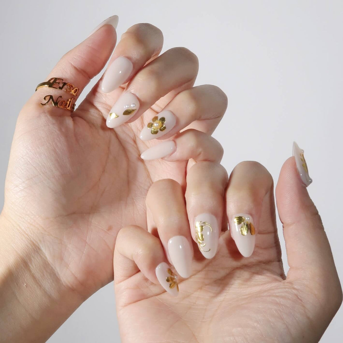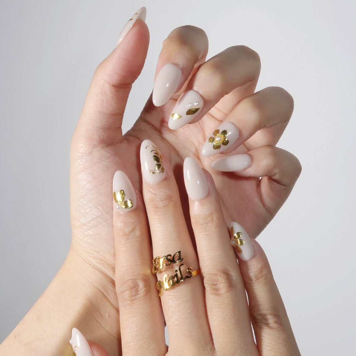 Dewlit Gold press-on nails by swara Nails feature a soft nude base with intricate gold flower patterns and delicate pearl embellishments. This elegant design combines subtle sophistication with a touch of luxury, offering you a salon-worthy look in an instant. Perfect for both special occasions and everyday elegance, these press-on nails provide a convenient and beautiful solution for effortless style.