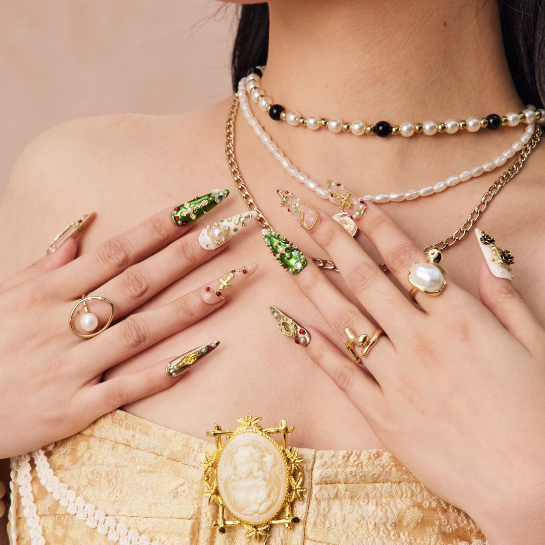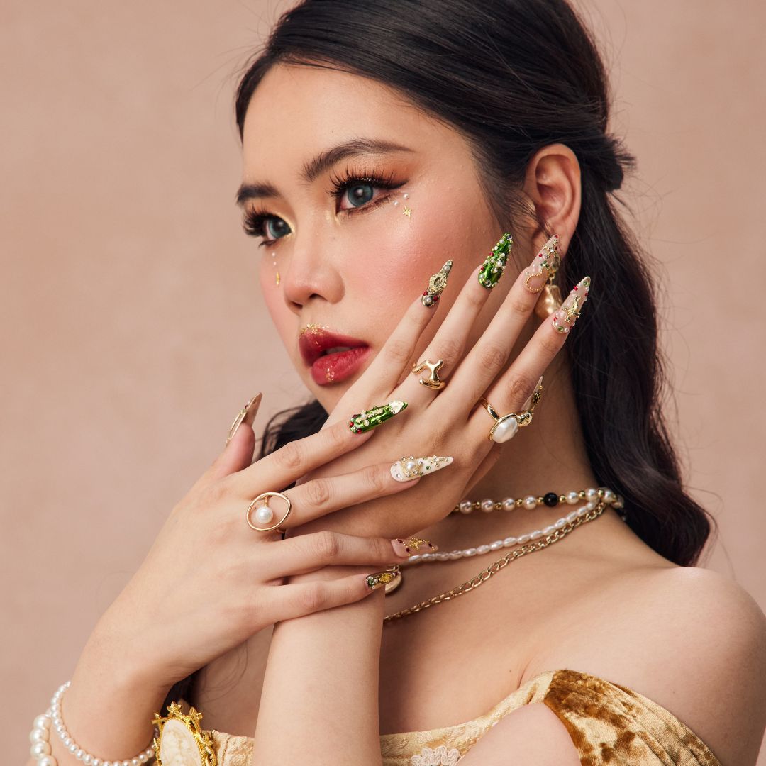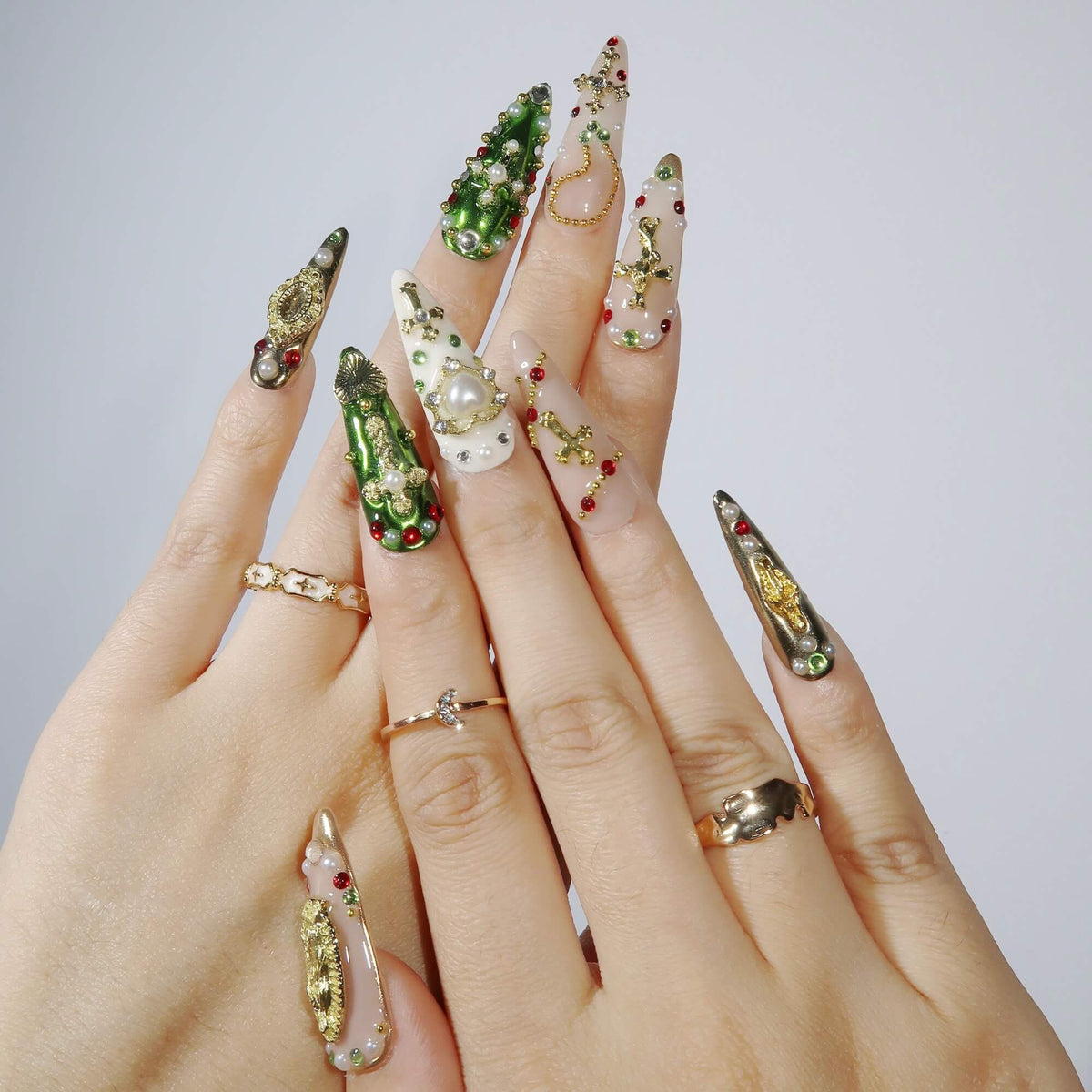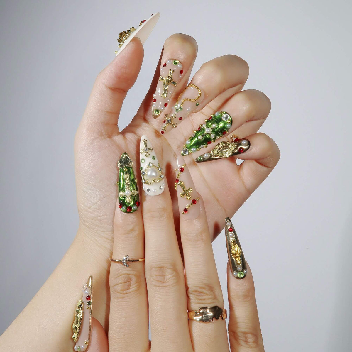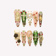 Make a timeless statement with Eternal Faith, an intricately designed press-on nail set inspired by spirituality and devotion. Featuring a rich color palette of gold, green, and white, this set showcases religious symbols like crosses, hearts, roses, and the Virgin Mary, all beautifully accented with golden charms. Sparkling diamond and pearl embellishments add a touch of luxury, making each nail a masterpiece. Perfect for those who embrace faith and elegance, Eternal Faith is a profound expression of style and belief.