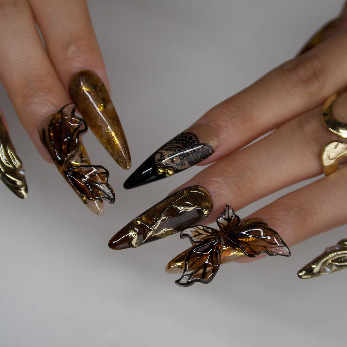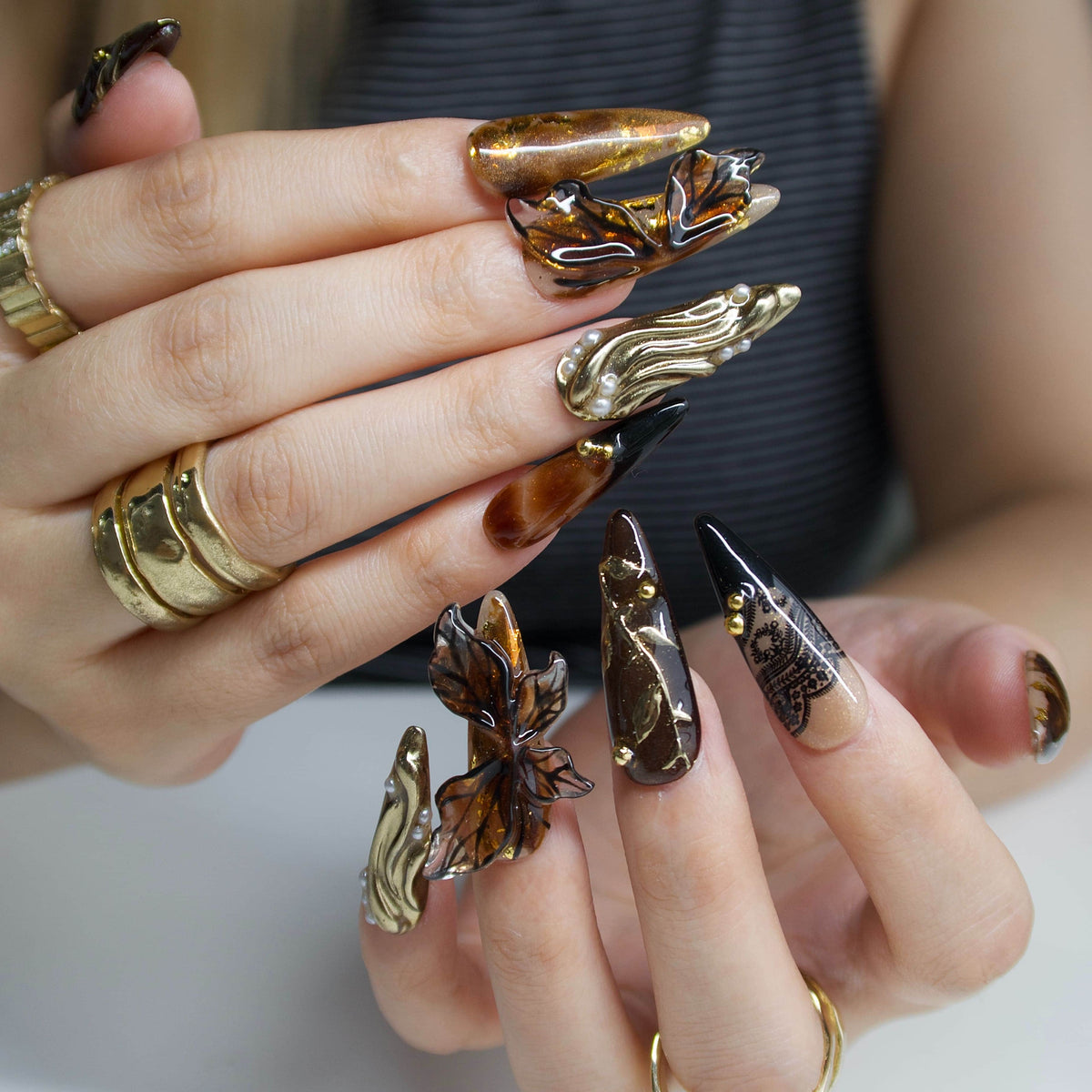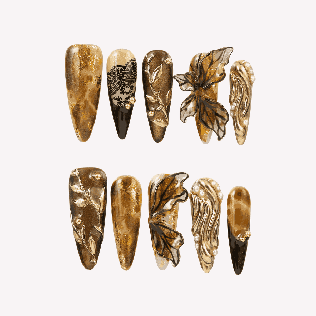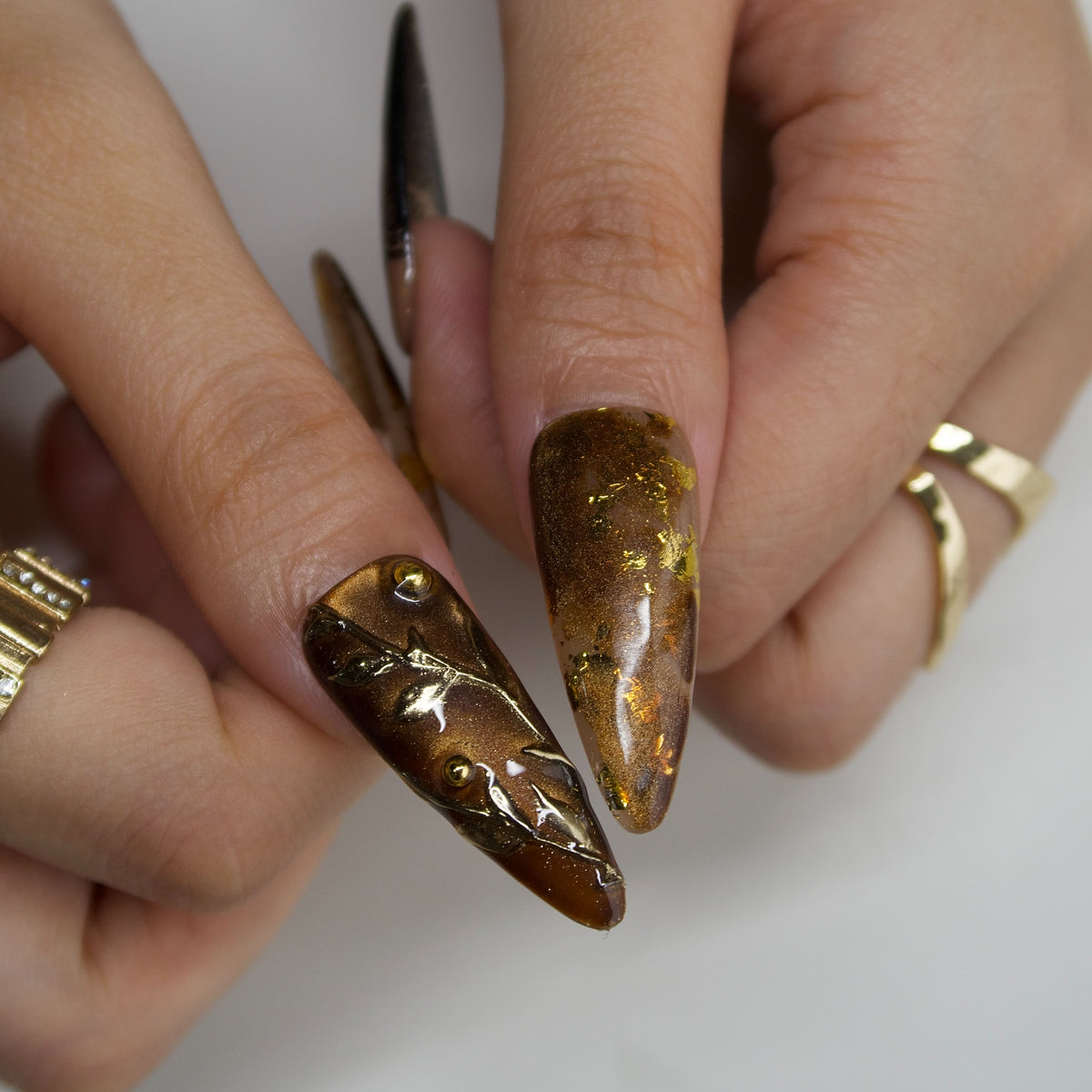 Fallen Muse by tonails is an enchanting press - on nails set inspired by nature’s artistry. Featuring a rich, warm palette with shimmering golds, earthy browns, and delicate leaf - like accents, it evokes the beauty of autumn oak leaves. The combination of intricate patterns, 3D - like butterfly details, and metallic finishes creates a whimsical, woodland - inspired vibe, perfect for adding a touch of organic elegance to special occasions or nature - themed gatherings. Bold yet refined, it’s a stunning choice for those who adore artistic, nature - inspired and luxurious nail styles.