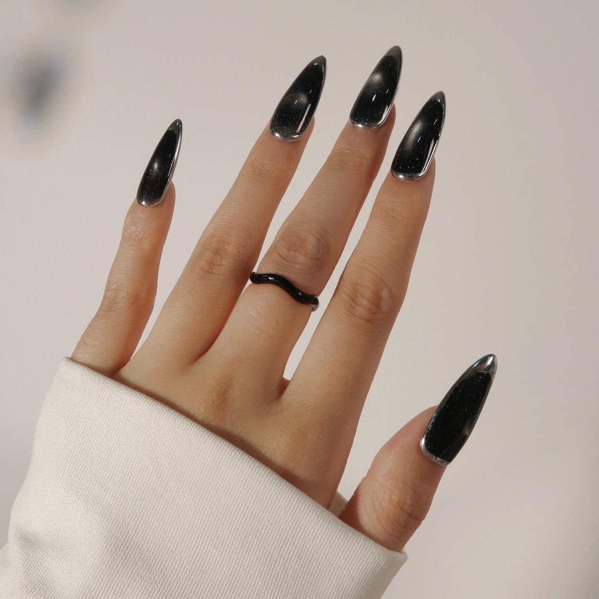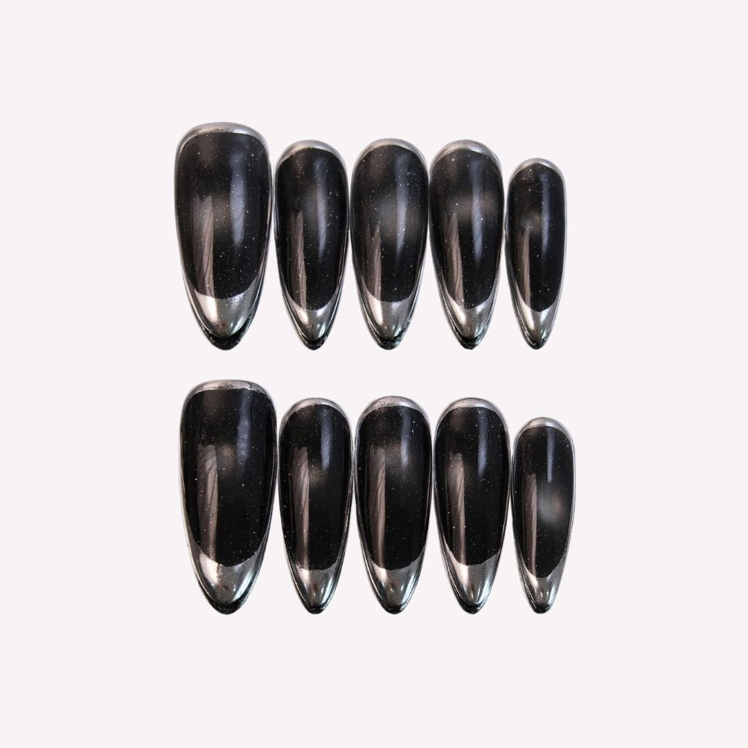 Embrace the enigmatic charm of the cosmos with swara Nails' Galaxy press-on nails, a set designed to mirror the vast and infinite beauty of the universe. These sleek, glossy black nails capture the essence of the night sky, with subtle speckles that mimic the distant twinkle of stars. Each nail is a portal to the stars, with a deep, opaque base that gives way to a light-reflective finish, creating an effect of depth and space that's as boundless as the galaxy itself. Perfect for those who wish to make a bold, sophisticated statement, Galaxy nails are your fingertips’ voyage into the depths of space, marrying simplicity with the profound allure of the night sky.