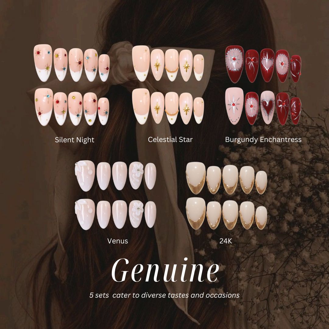 Versatile and effortlessly elegant, the Genuine is designed to suit any occasion. Featuring a mix of short and medium-length press-on nails, this collection offers the perfect balance of comfort and style. With a focus on nude tones, these nails are a timeless choice that complements every outfit and mood. Whether you’re heading to a casual brunch or a formal event, the Genuine ensures you’re always polished and prepared.