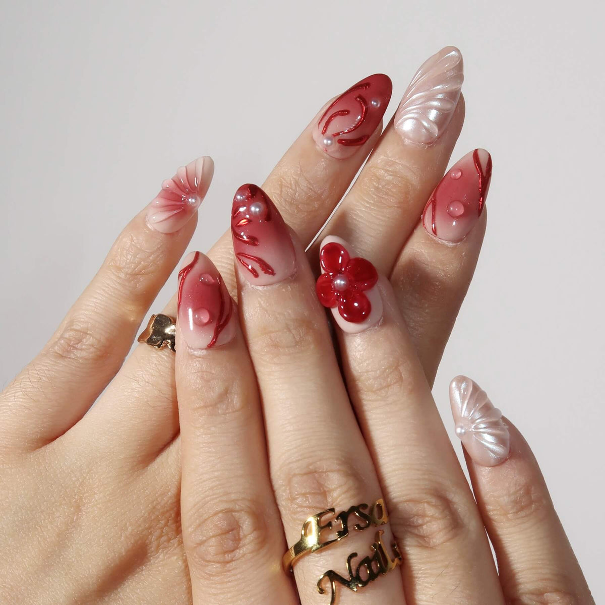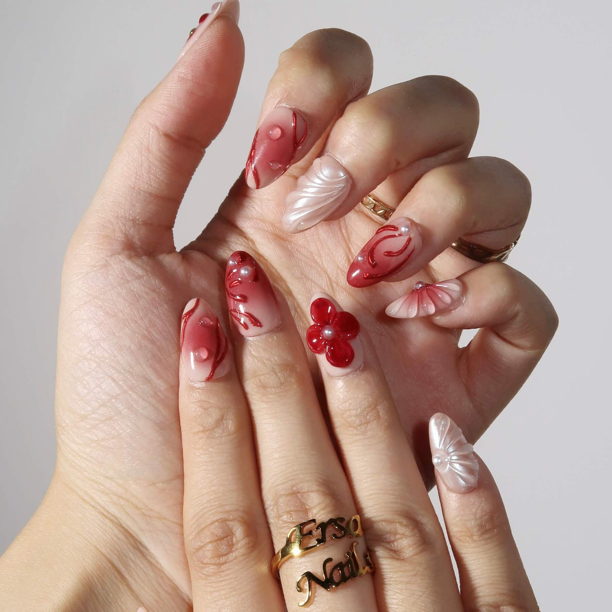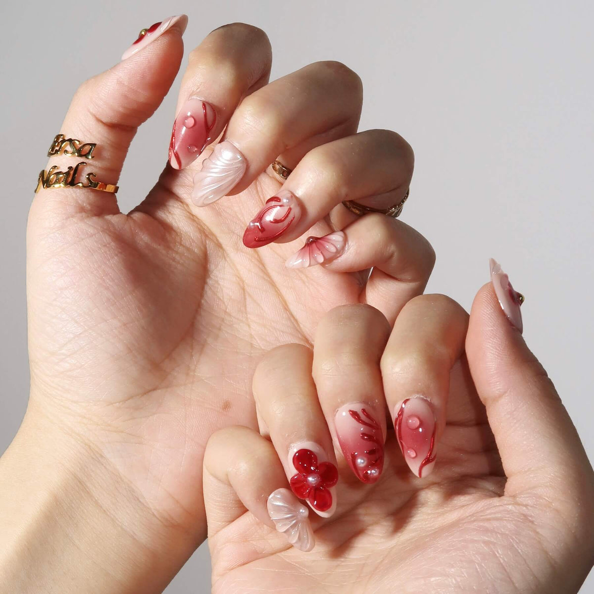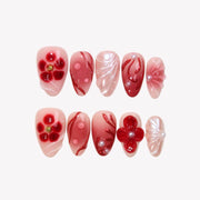 Capture the beauty of blooming florals with swara Nails Inflorescence press-on nails. Featuring a soft nude base with vibrant red undertones and a stunning red ombré design, this set is enhanced with delicate flower patterns, intricate 3D floral embellishments, and unique 3D mermaid designs. The addition of pearl accents brings a touch of elegance and charm, making this design perfect for those who love a bold, floral-inspired manicure with a touch of whimsical beauty.