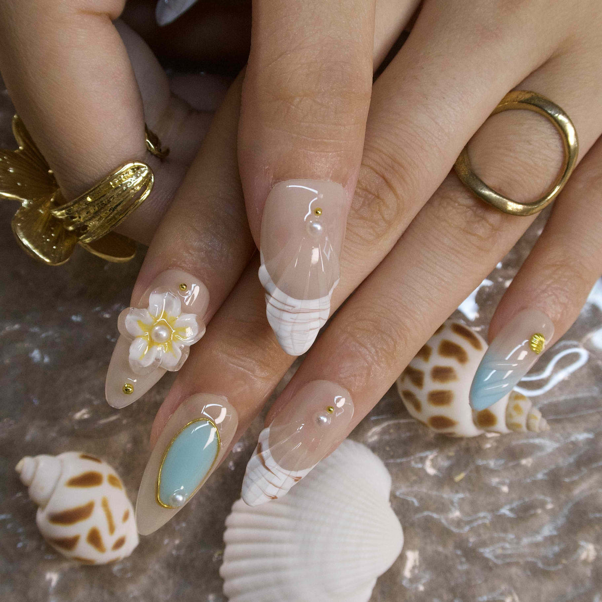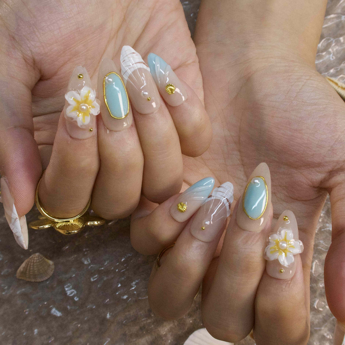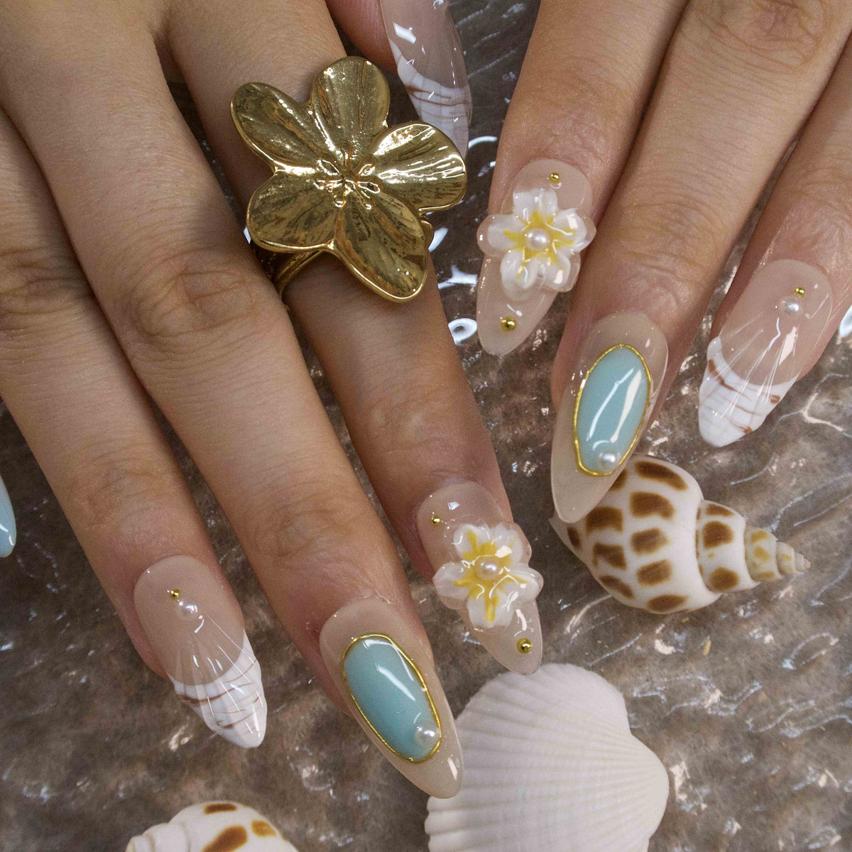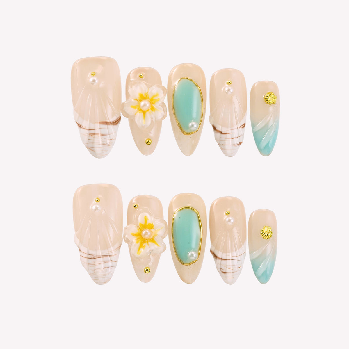 Mint Mambo by tonails weaves a breezy, tropical tale. On a soft, skin - toned base, pops of mint green blend with delicate yellow floral motifs and tiny pearl accents. The design evokes the laid - back charm of a beachside garden at dawn, where gentle breezes carry the scent of blossoms. The fresh, nature - inspired color scheme radiates a carefree, summery elegance, perfect for infusing daily looks with a touch of coastal - bohemian charm. Pair it with a linen maxi dress, a straw hat, or turquoise jewelry to complete the effortlessly chic, island - ready vibe.